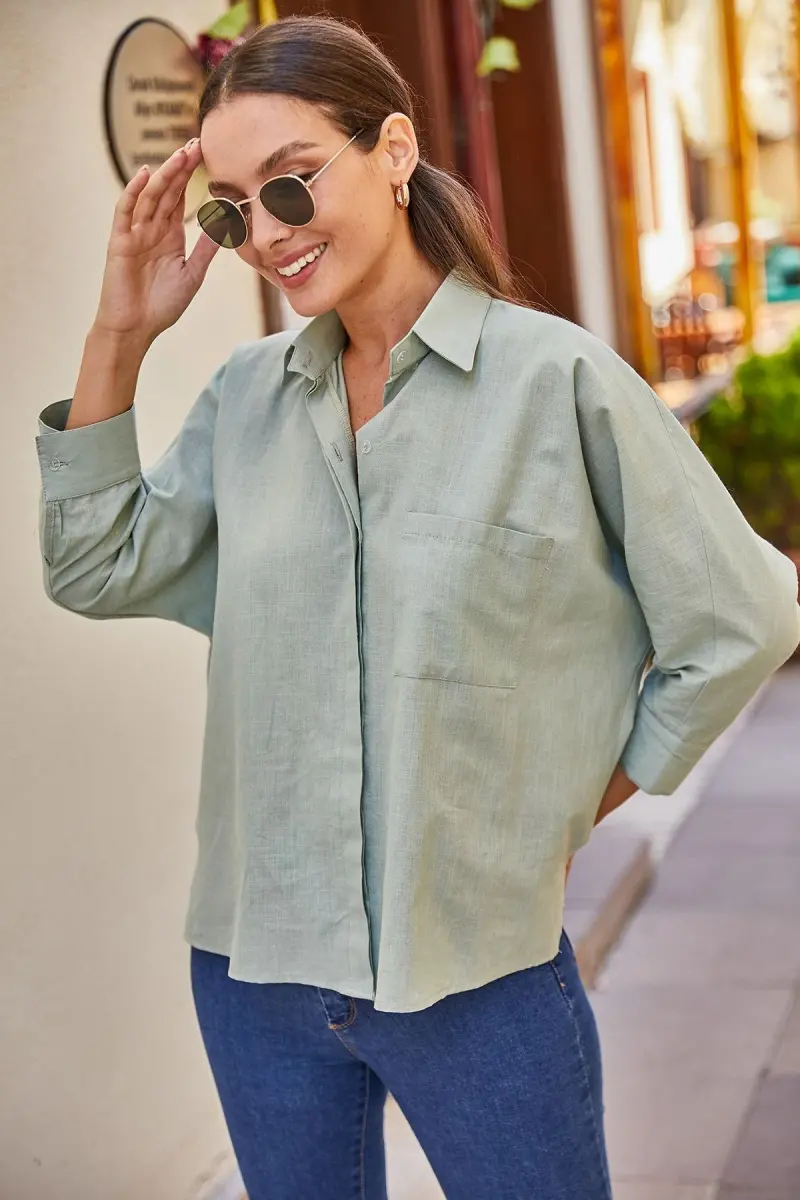 Kadın Mint Cepli Salaş Keten Gömlek ARM-21Y001035-Mint