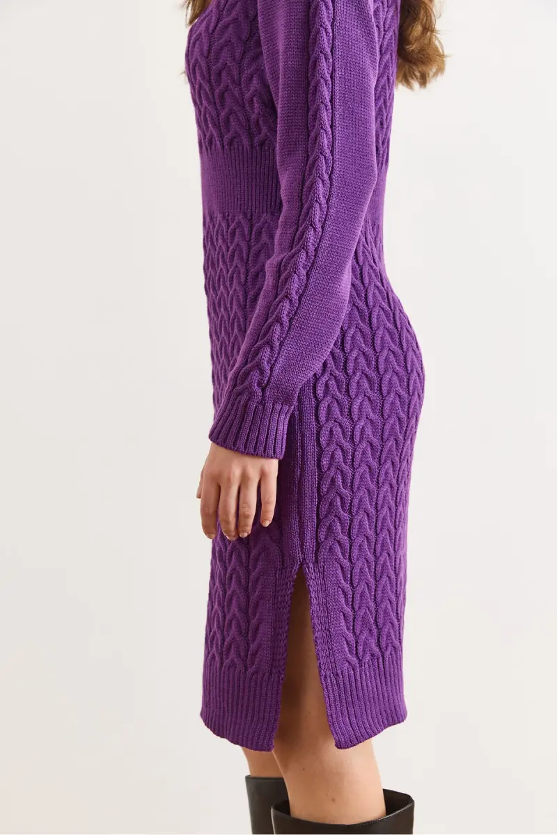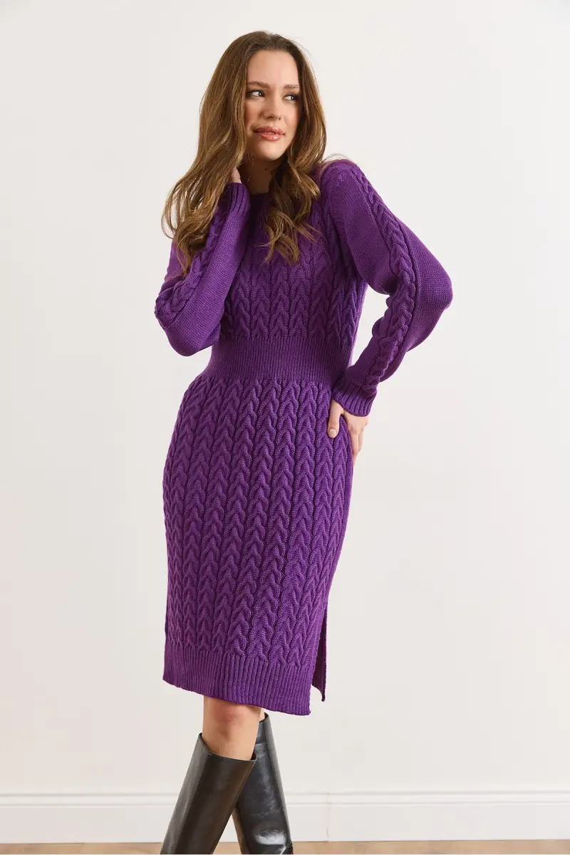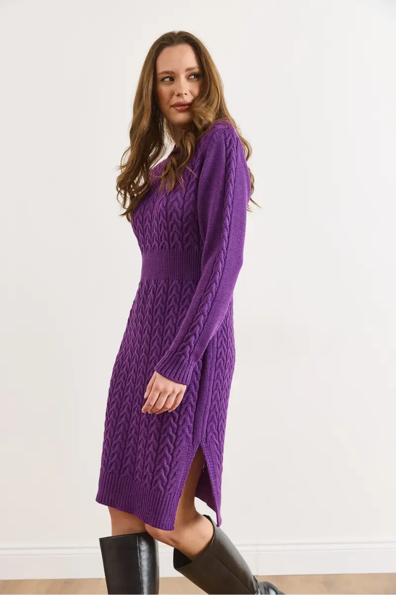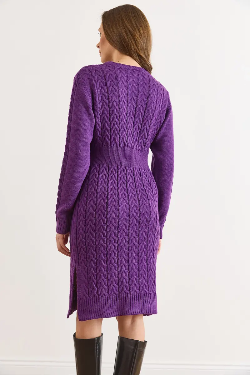 Kadın Mor Beli Bantlı Yırtmaçlı Saç Örgü Mini Elbise ELB-19002289-Mor