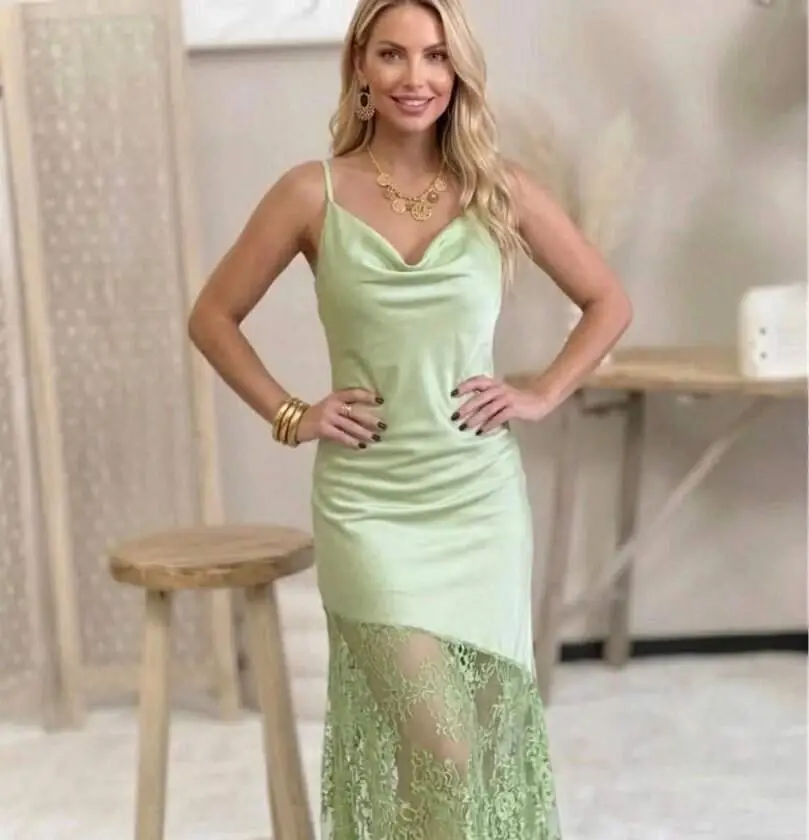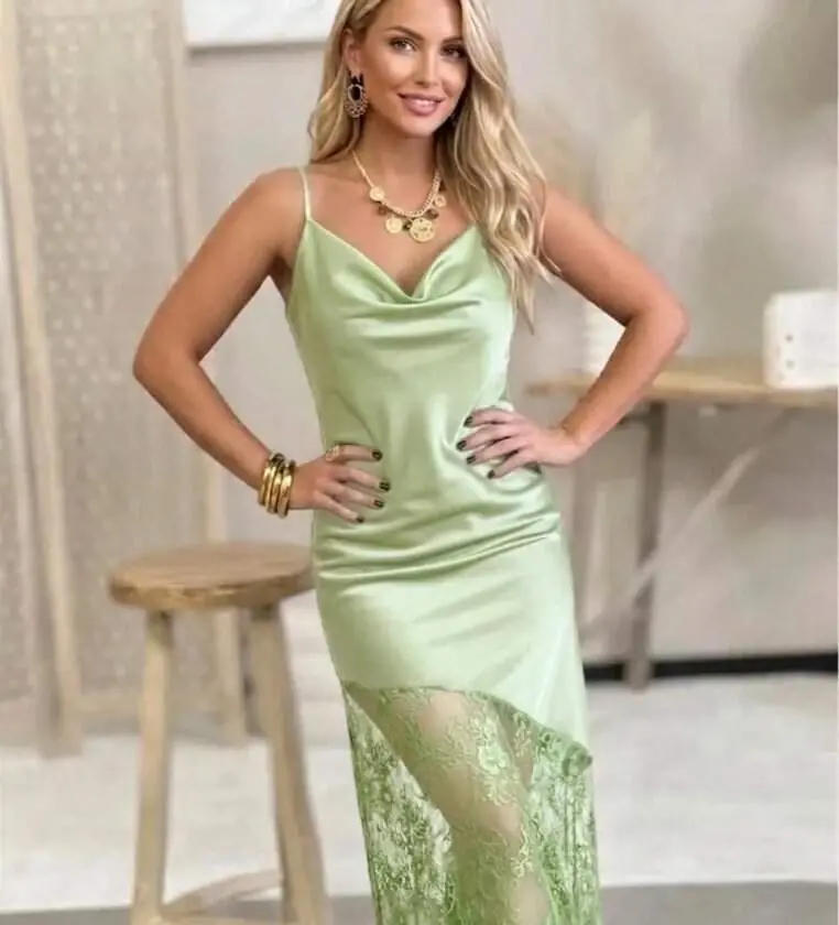 Kadın Omuz Askılı Fantel Güpür Transparan Detay Saten Elbise