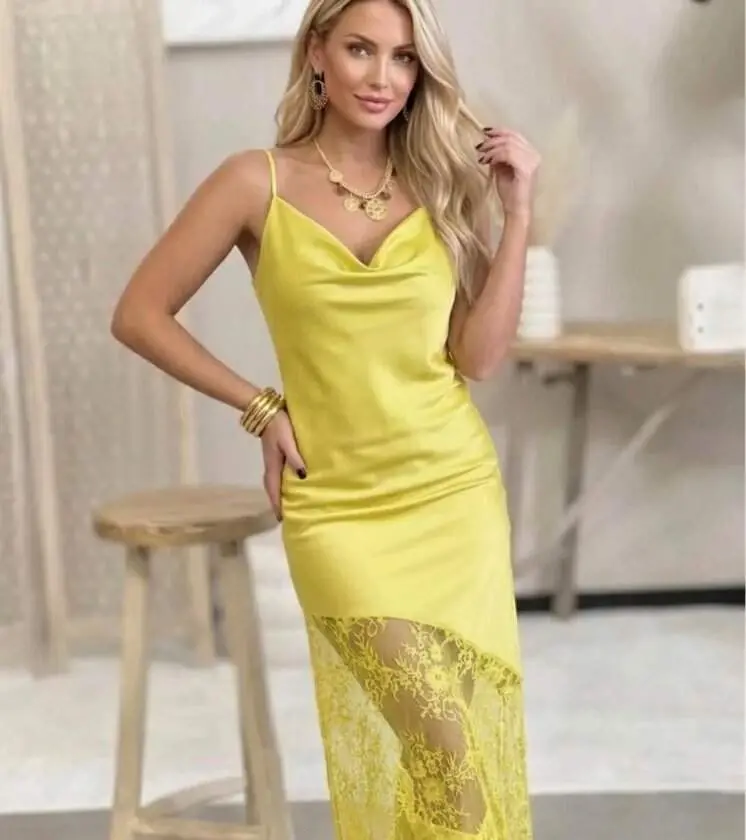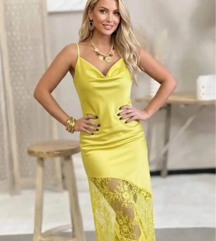 Kadın Omuz Askılı Fantel Güpür Transparan Detay Saten Elbise