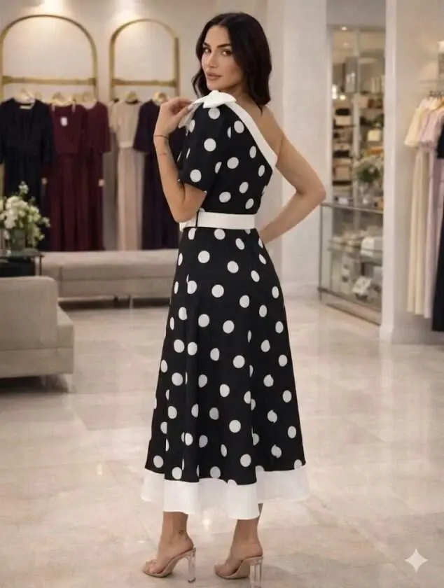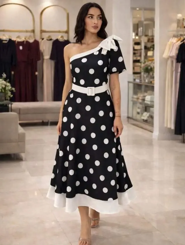 Kadın Omuz Dekolteli Fiyonk Ve Puantiye Detay Maxi Boy Elbise