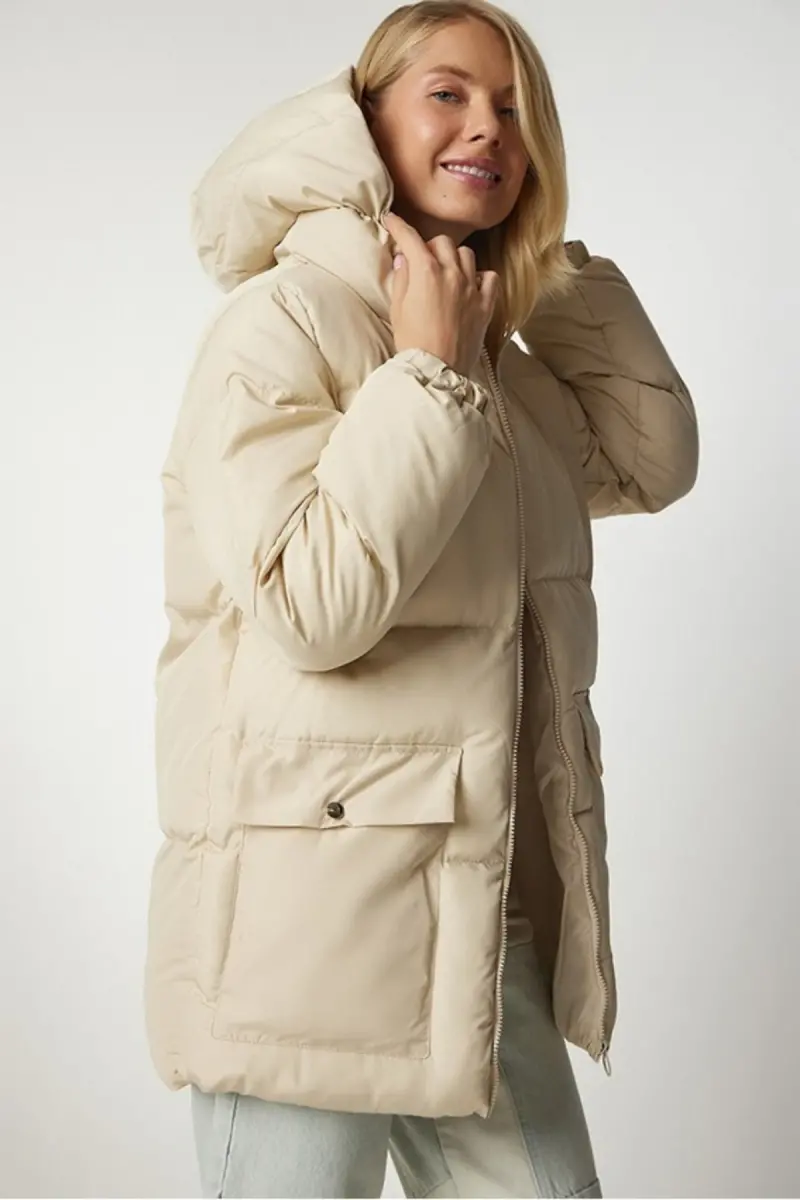 Kadın Oversize Şişme Mont Kapüşonlu - 4 Cep Detaylı Fermuarlı Kışlık Günlük Mont-Bej4cp