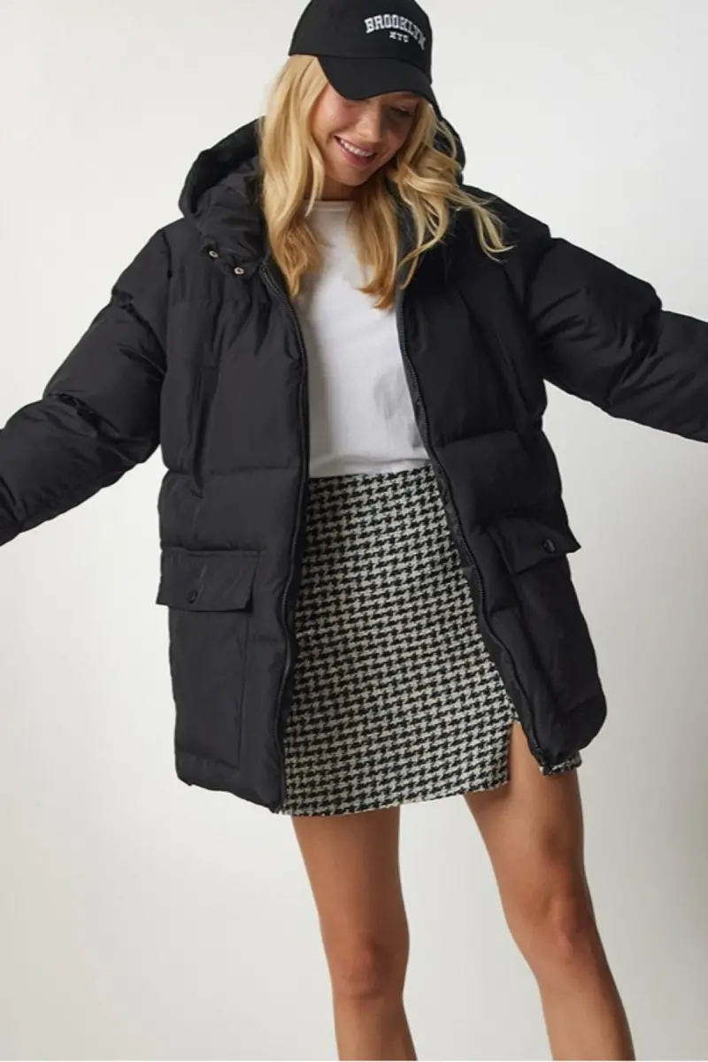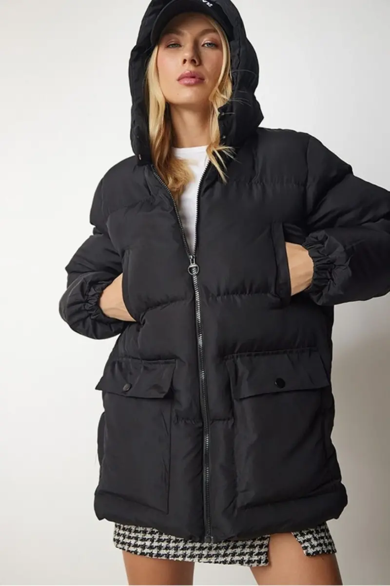 Kadın Oversize Şişme Mont Kapüşonlu - 4 Cep Detaylı Fermuarlı Kışlık Günlük Mont-Siyah4cp