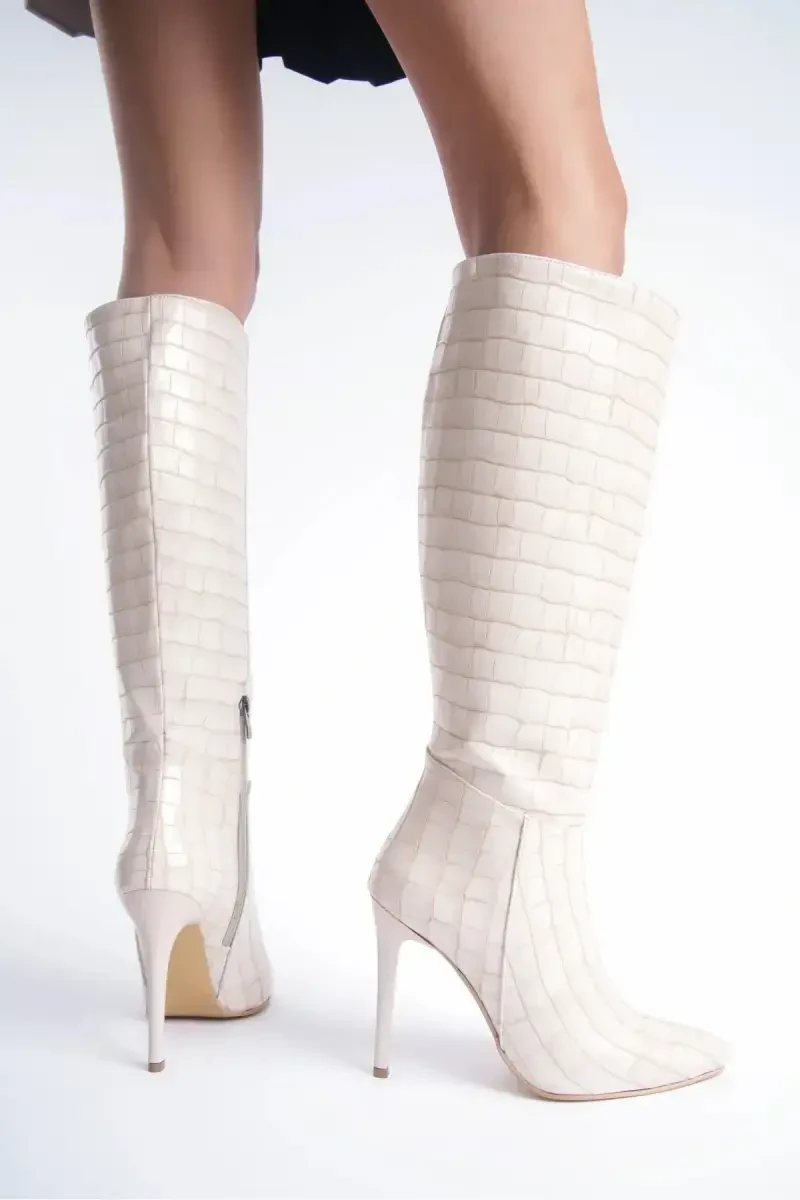 Bej Croco Krokodil Çizme | Kadın Özel Tasarım Topuklu Çizme