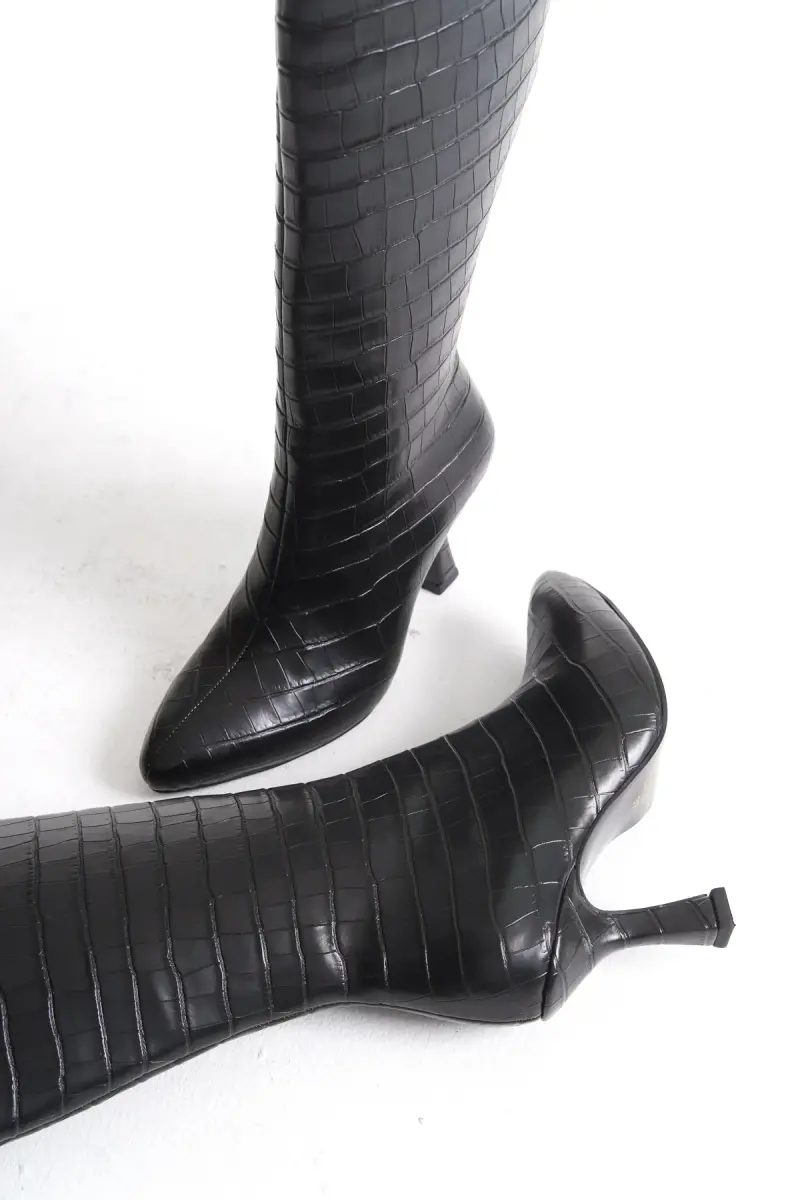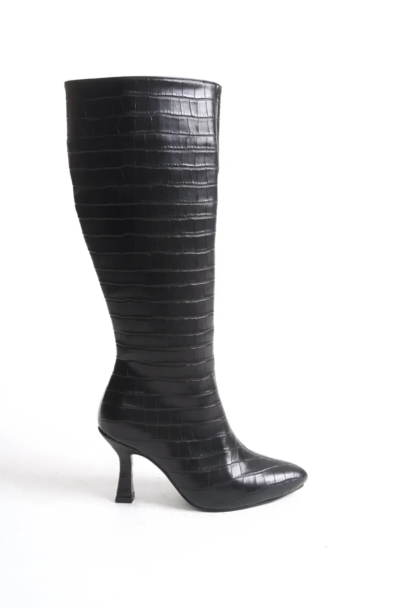 Kadın Özel Tasarım Tam Fermuarlı Croco Kaplama Topuklu Çizme-Siyah Croco Kadeh Ökçe