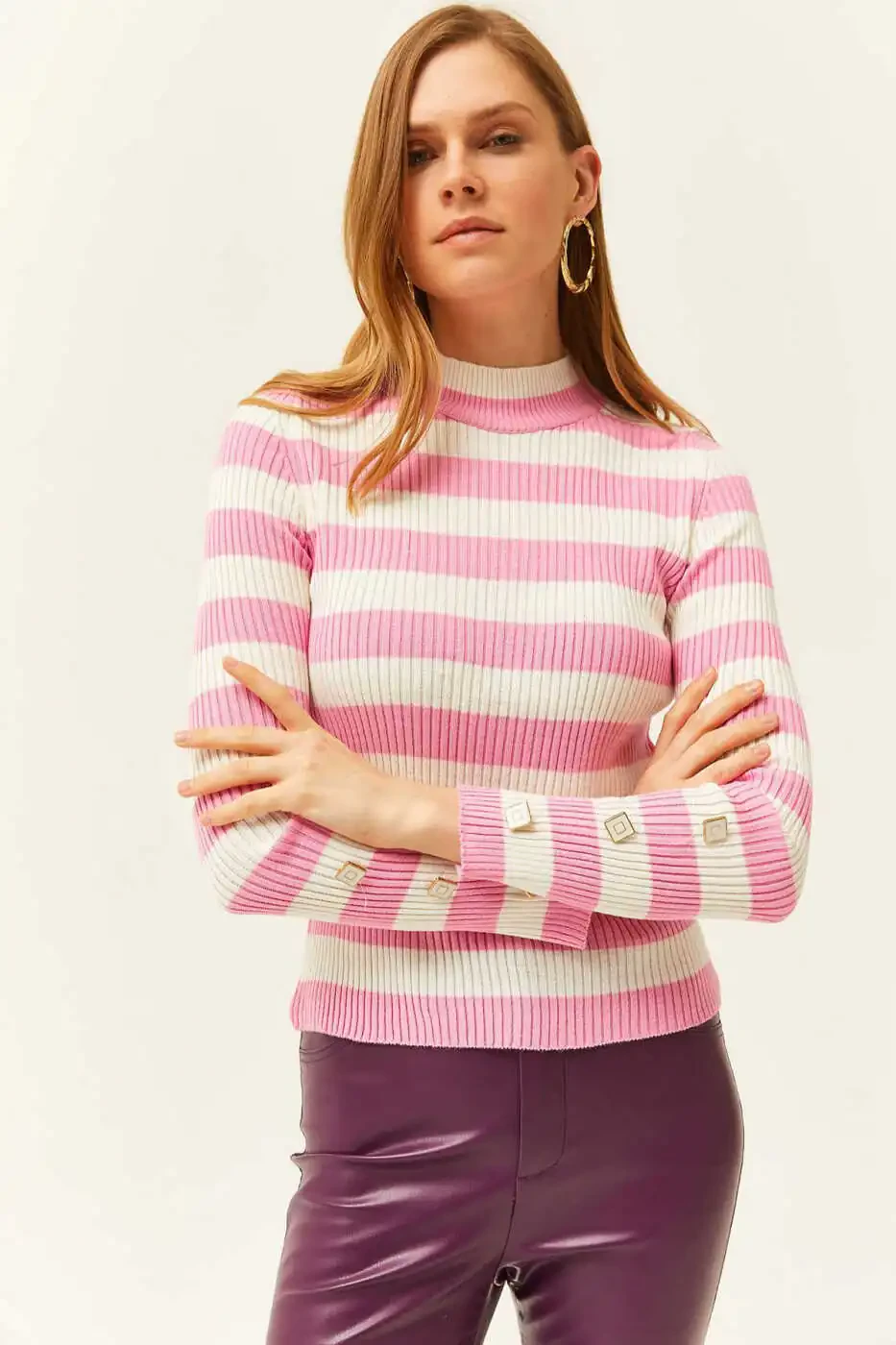 Kadın Pembe Çizgili Kolu Düğmeli Triko Kazak: Şık ve Rahat