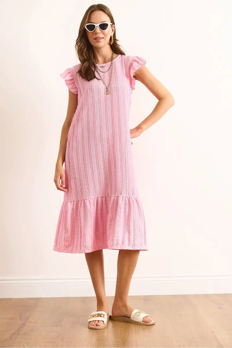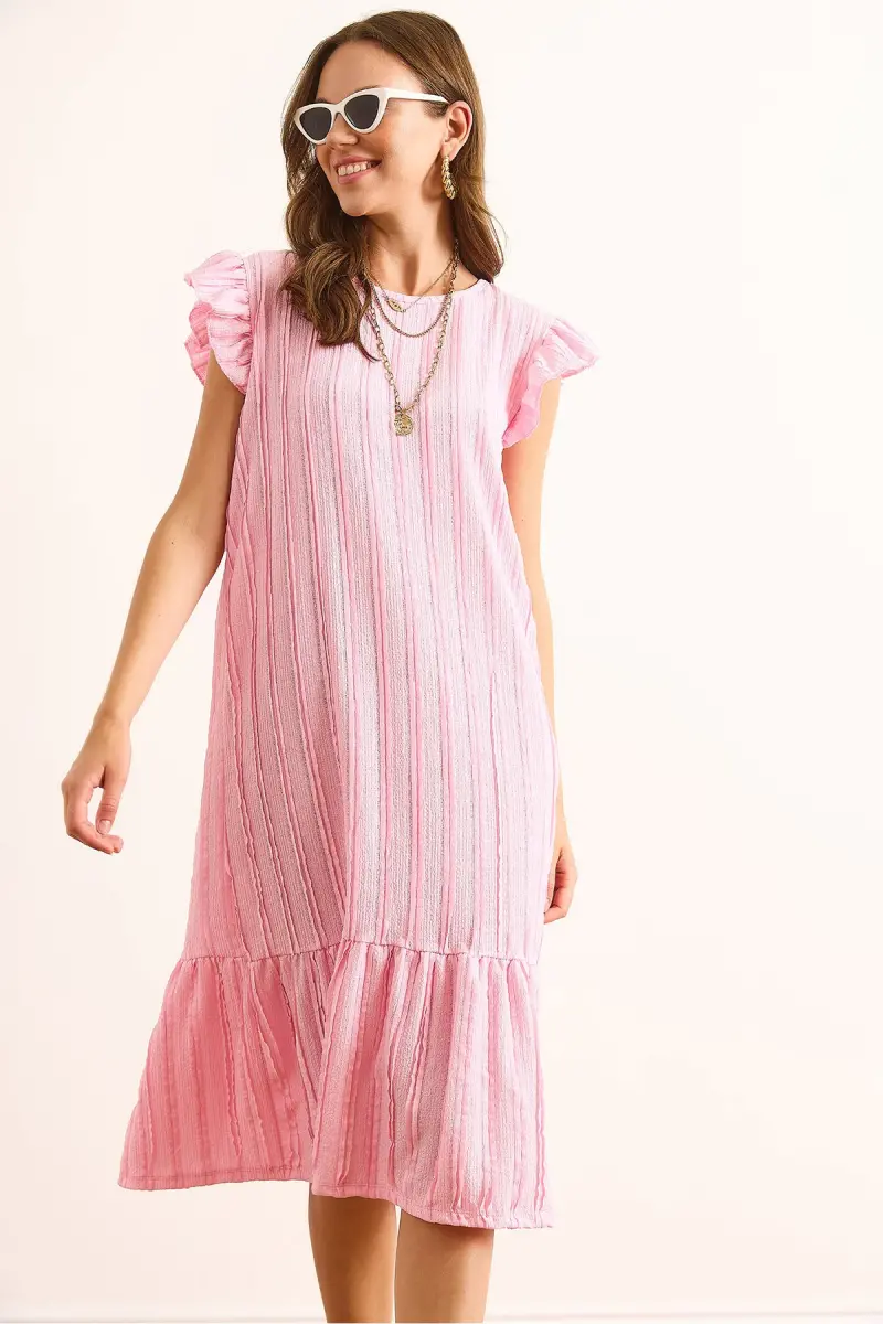 Kadın Pembe Kol Etek Fırfırlı Dokulu Midi Elbise ELB-19002364-Pembe