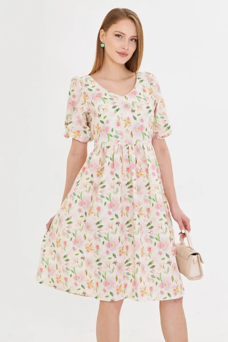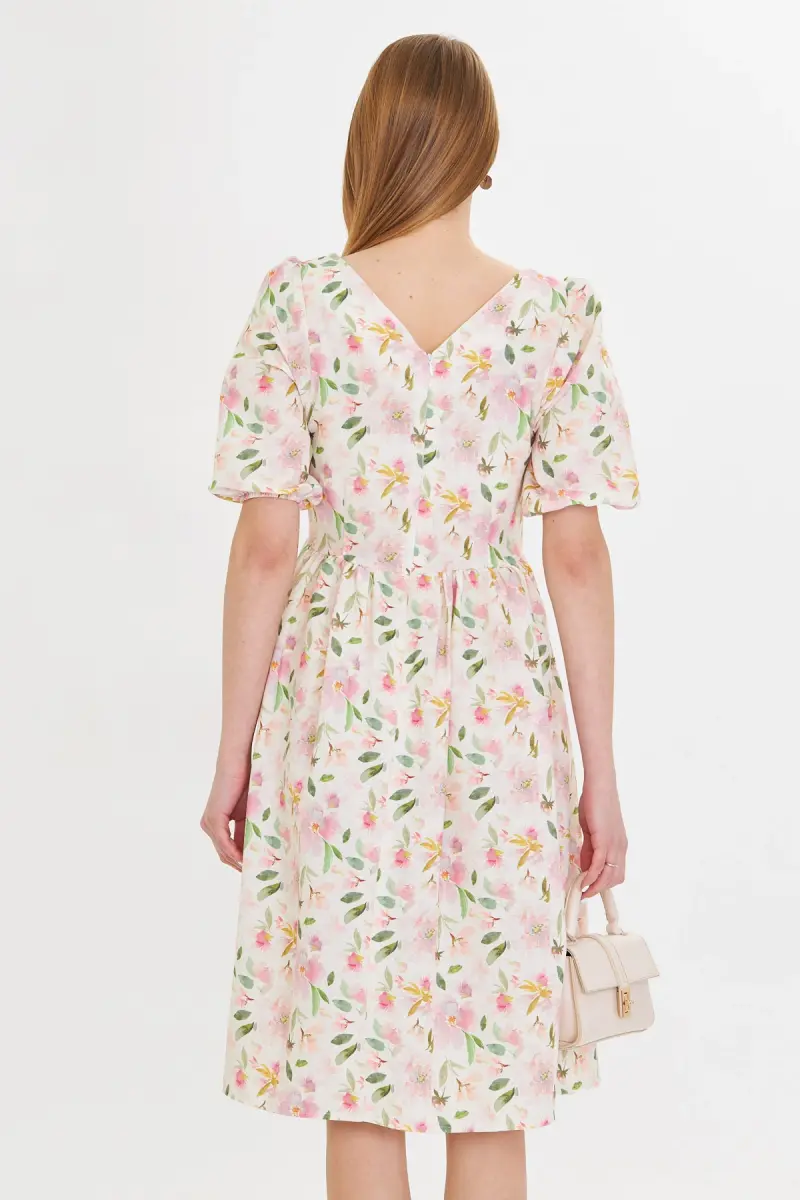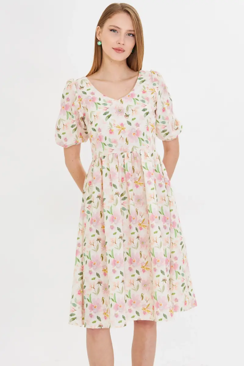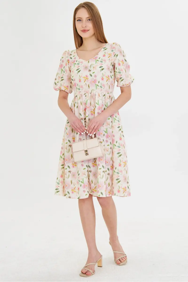 Kadın Pembe U Yaka Kolları Lastikli Beli Büzgülü Midi Boy Elbise ARM-25Y001003-Pembe
