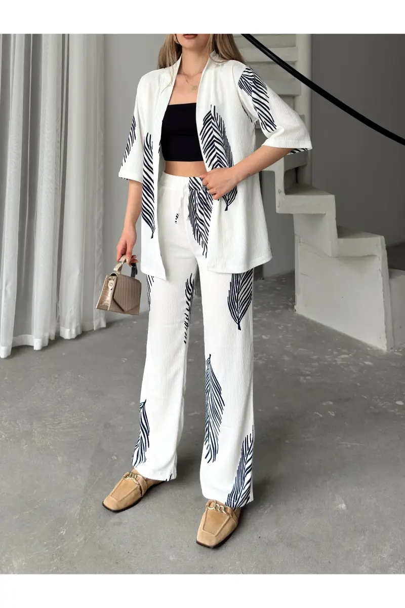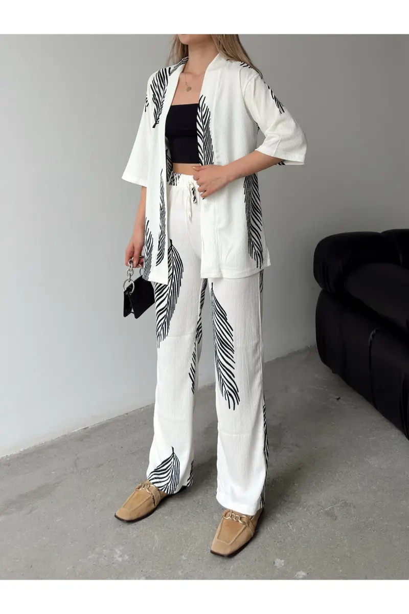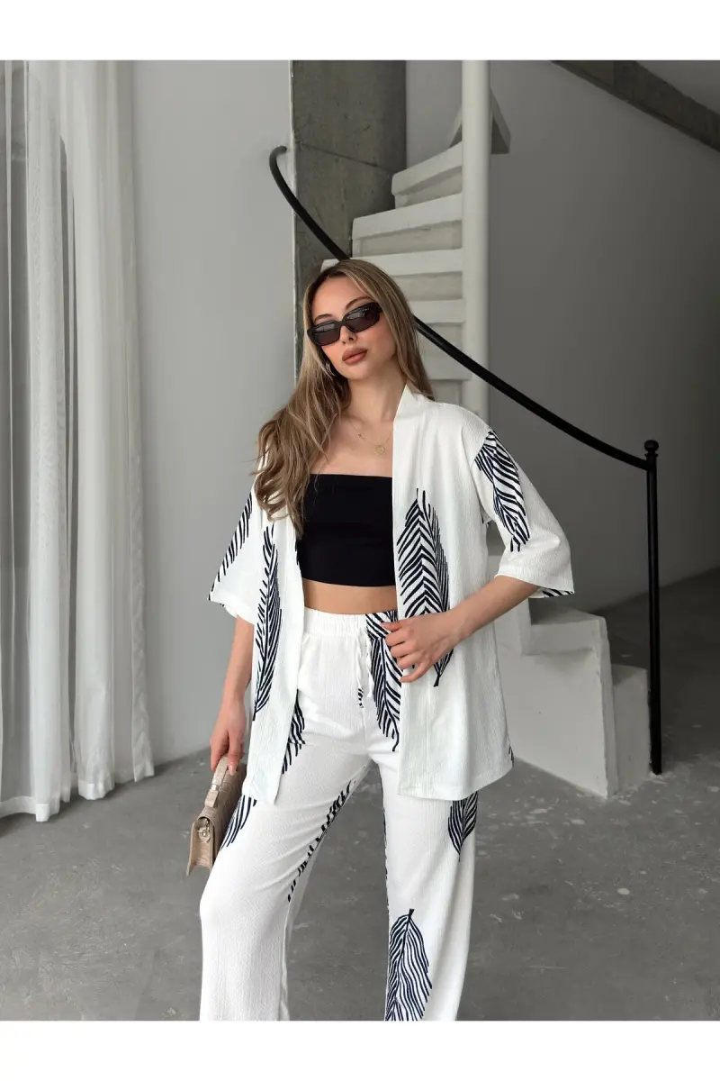 Women's Relaxed Fit Kimono Set - Black is a must-have piece in the modern woman's wardrobe, combining elegance and comfort. This special design is an ideal option for both daily use and special occasions. Consisting of a kimono-style top and relaxed-fit bottom, this set allows you to look stylish without restricting your freedom of movement. Carrying the nobility and elegance of black, this set can be easily combined with different accessories and allows you to attract attention in any environment.**Product Description**Women's Relaxed Fit Kimono Set - Black is a stylish and comfortable option that adapts to the modern woman's lifestyle. You can choose this set whether you are spending a relaxing day at home or going out with friends, and it will help you reflect your style in any situation. The wide sleeves and draped cut of the kimono top offer both comfort and an elegant look. The comfortable cut of the bottom piece preserves your freedom of movement throughout the day. The classic and timeless stance of the black color makes the set wearable in any environment. You can easily create your own style by combining it with accessories and shoes in different colors. Whether you complete it with sneakers for a sporty look or high heels for a chic invitation, this set will always be eye-catching. Moreover, thanks to its high-quality fabric, it offers long-lasting use and is easy to wash and iron. Women's Relaxed Fit Kimono Set - Black is not just an outfit, but also a lifestyle. This set will accompany you whenever you want to feel good and look stylish. Discover this set, which is a candidate to be an indispensable part of your wardrobe, and bring a new breath to your style. With its wearable structure in every season, it will be your favorite outfit throughout the year. It offers a modern and comfortable elegance that reflects you in both daily use and special occasions. Feel special with the Women's Relaxed Fit Kimono Set - Black.**Product Features*** Relaxed fit* Kimono style top* Black color* Top and bottom set* Wide-sleeved top* Draped cut* Easy to combine* Wearable in every season* High-quality fabric* Long-lasting* Offers freedom of movement* Stylish and comfortable* Suitable for daily and special occasions* Compatible with different accessories* Easy care**Additional Information**The fabric content and washing instructions of the product are stated on the label. Please follow the instructions for maintenance. The size on the mannequin is S. Product colors may vary due to light differences in studio shots. Our products are shipped after being quality controlled.