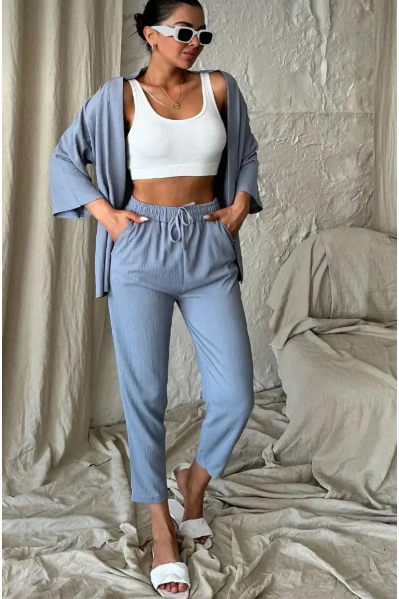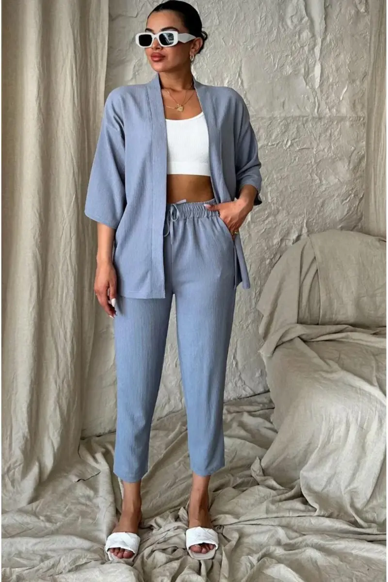 Kadın Rahat Kesim Kimono Alt Uzun Üst Yazlık Takım-mavi