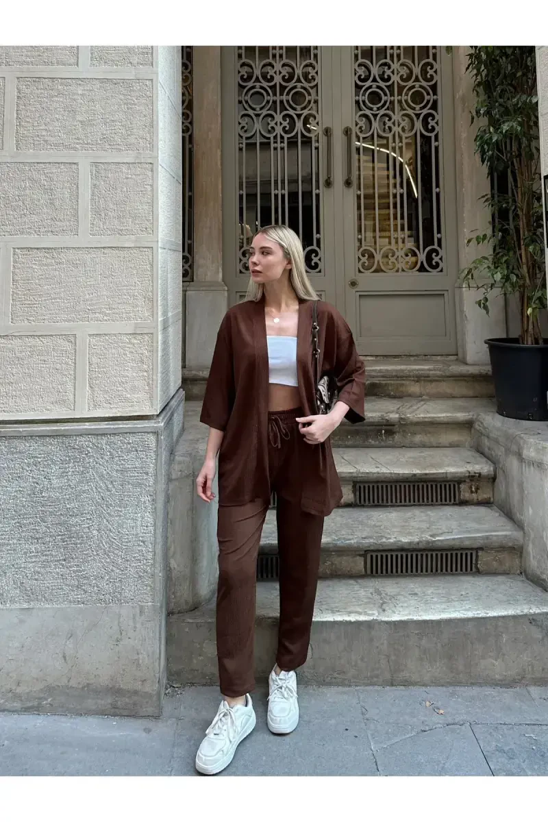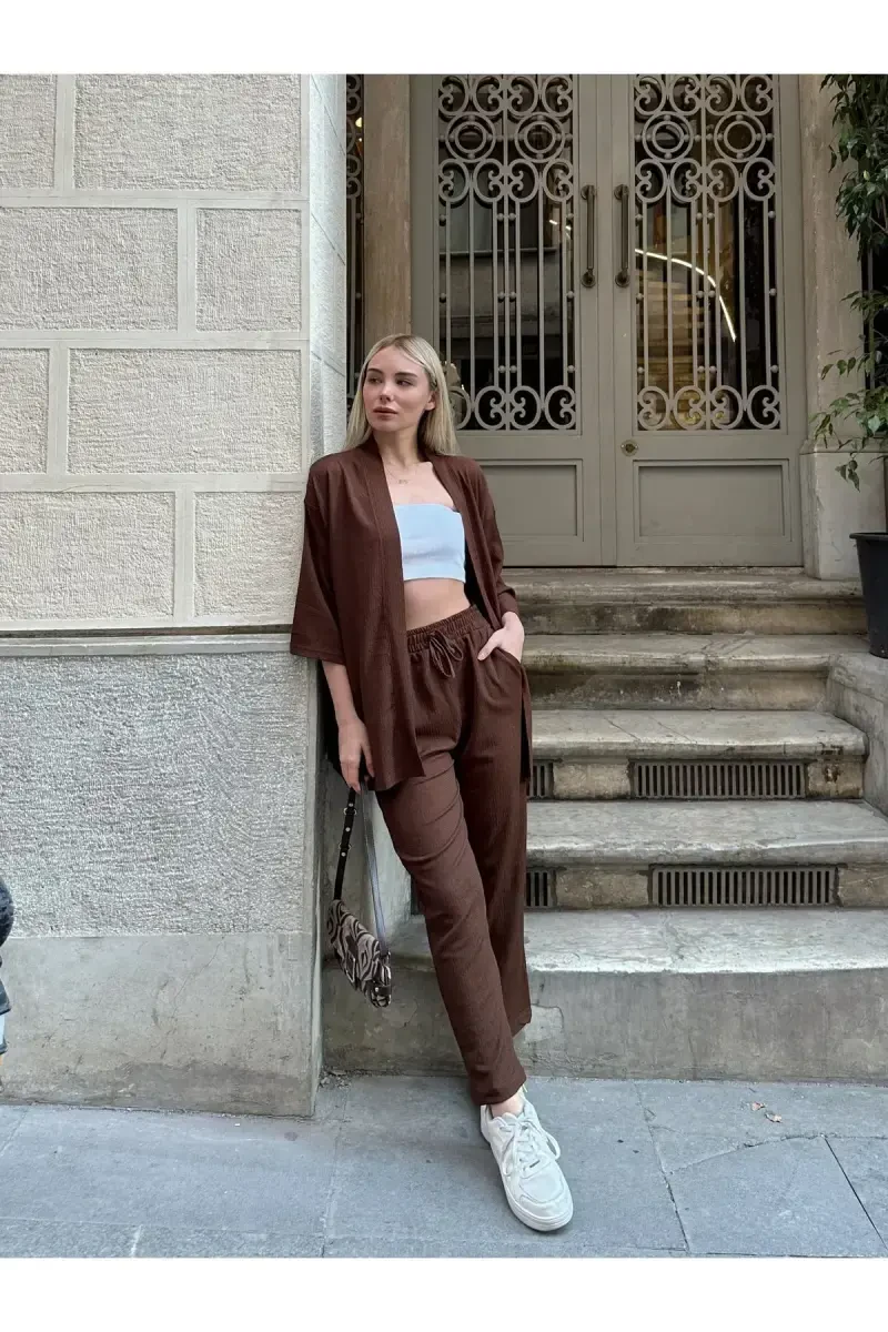 Kimono üst, zarif bir şekilde tasarlanmış, hafif ve nefes alan kumaştan üretilmiştir. Rahat kesim ve bol kol detayı, her vücut tipine uyum sağlamasını garanti eder. Alt ise rahat ve şık bir kesimle tasarlanmıştır. Pamuk ve keten karışımı kumaştan üretilen bu alt, gün boyu konforlu bir deneyim sunar.