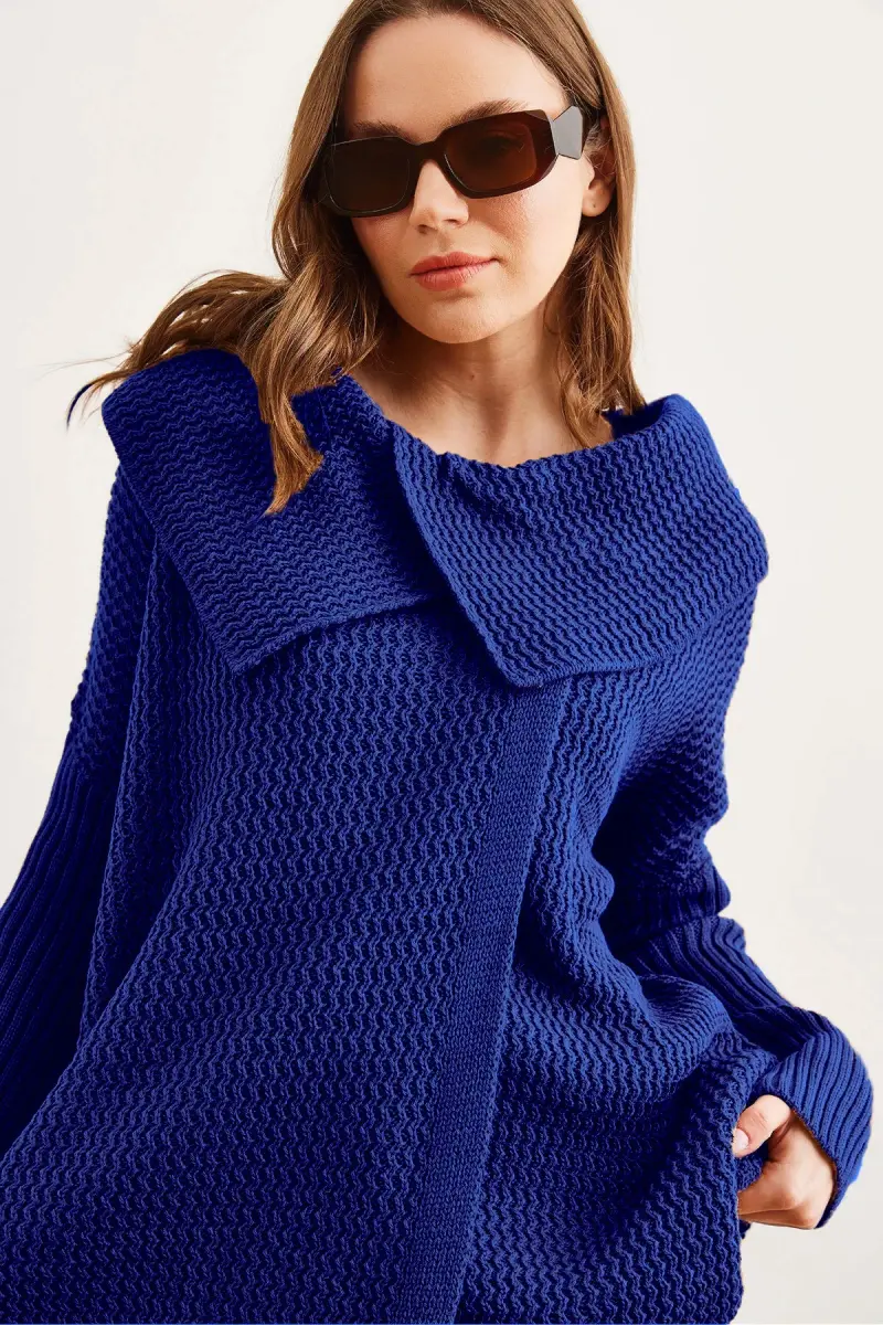 Kadın Saks Mavi Anvelop Yaka Düğmeli Triko Hırka HRK-19000326-Saks Mavi
