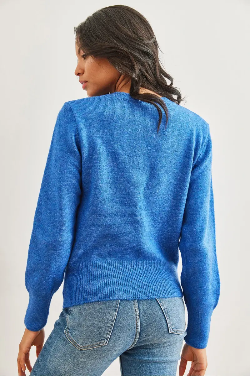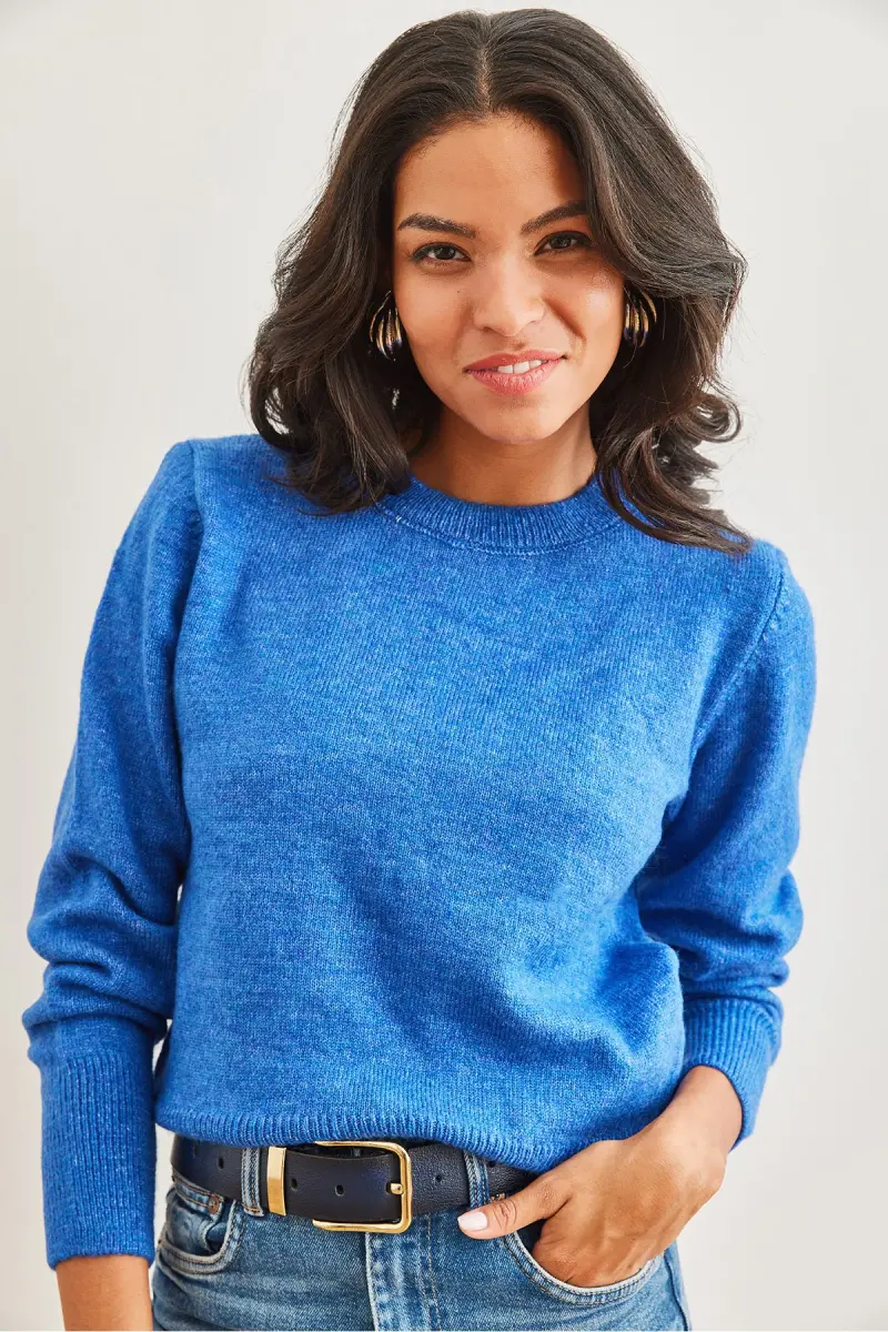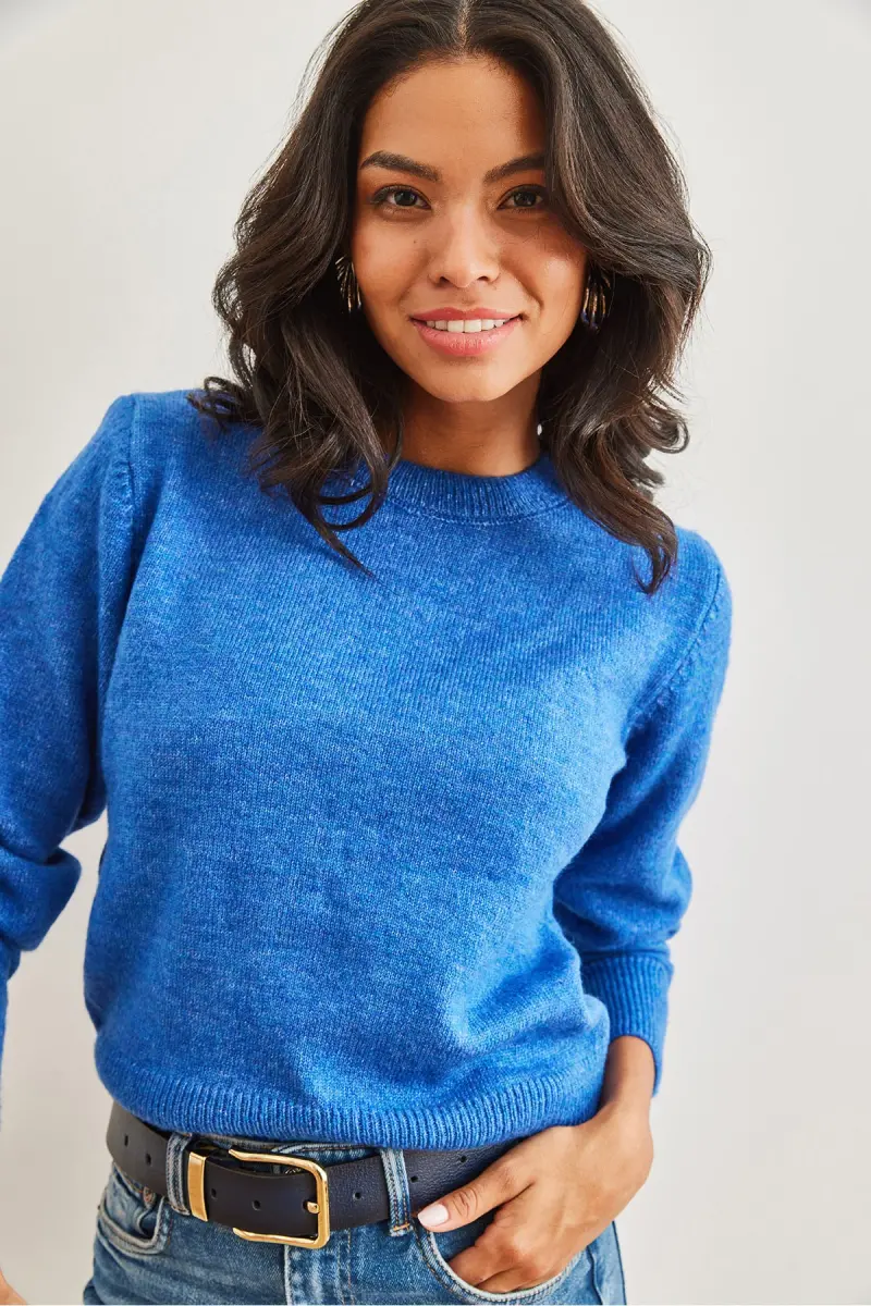 Kadın Saks Mavi Bisiklet Yaka Yumuşak Dokulu Basic Triko Kazak KZK-19000845-Saks Mavi