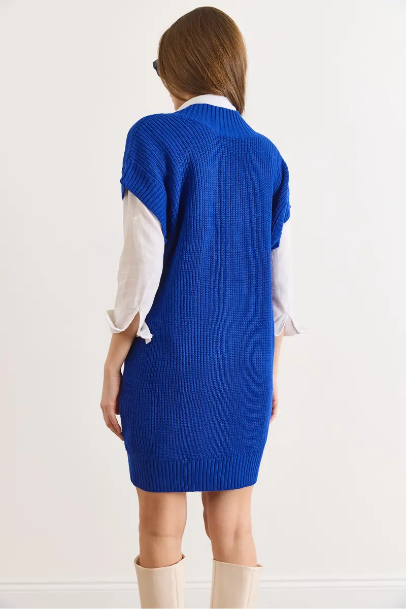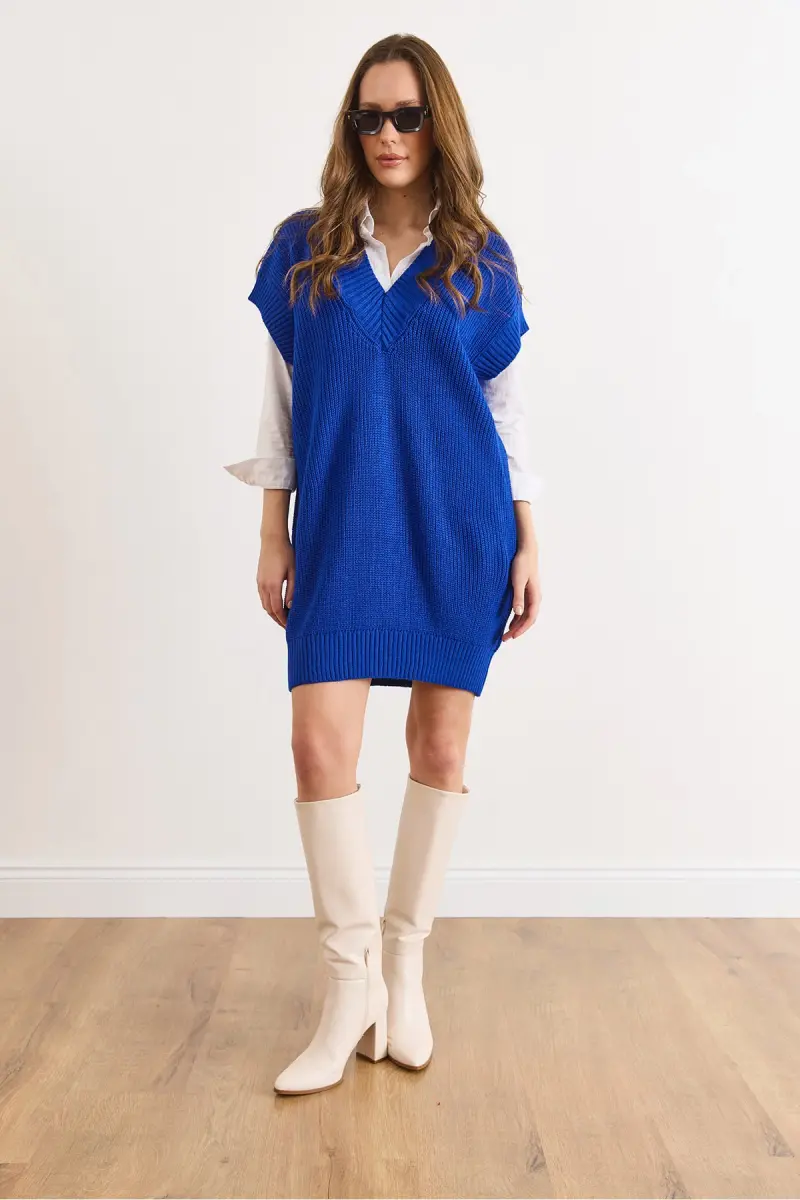 Kadın Saks Mavi V Yaka Triko Tunik Elbise ELB-19002343-Saks Mavi
