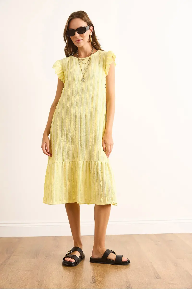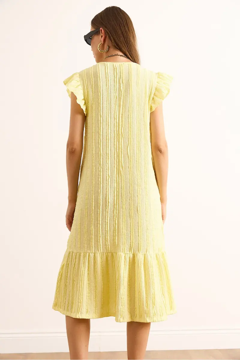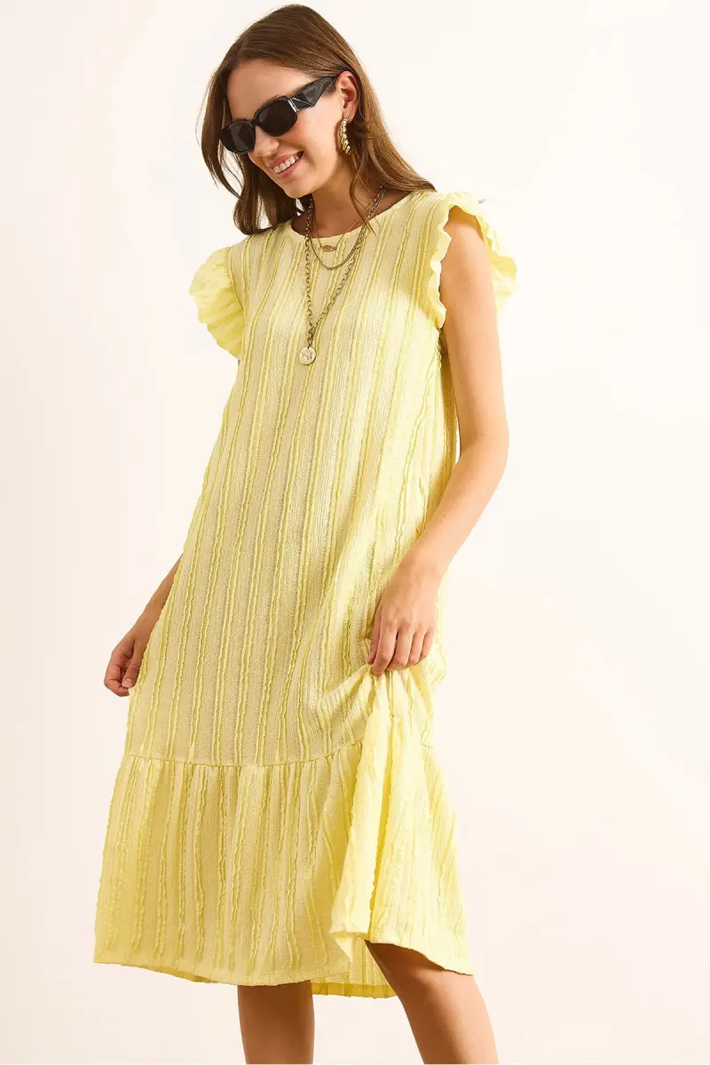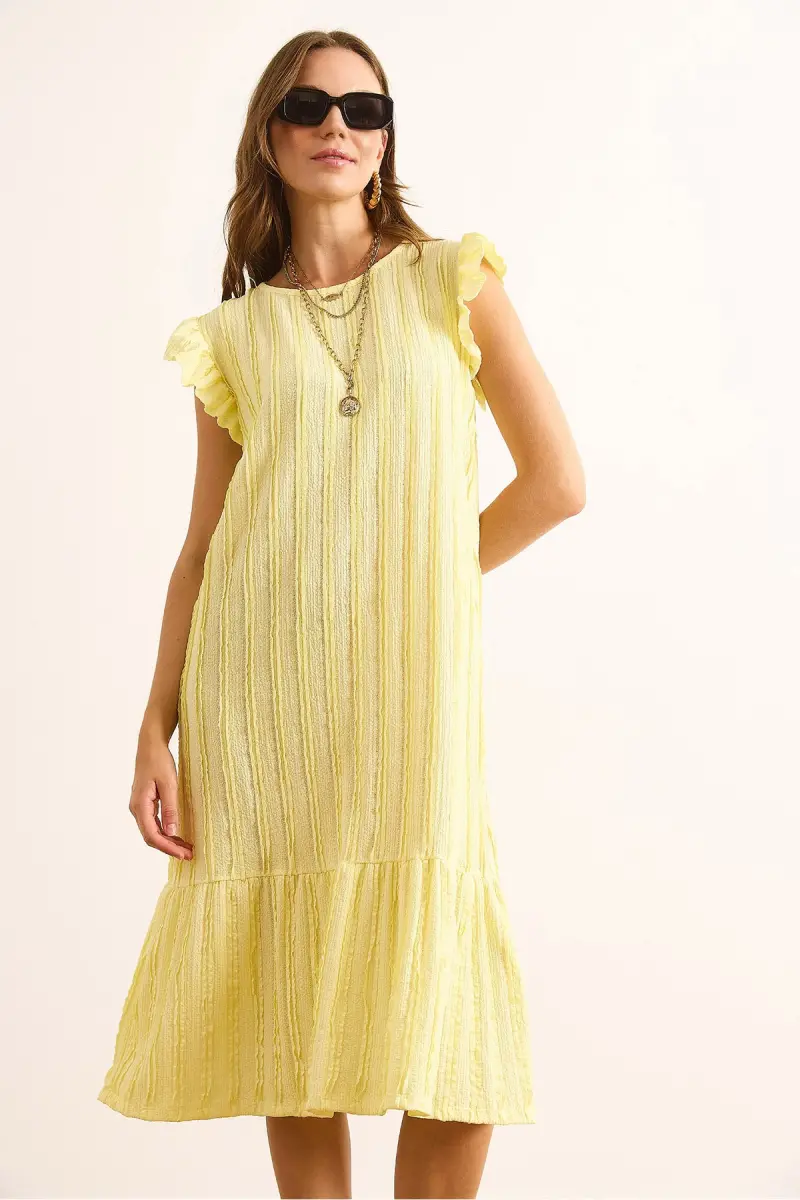 Kadın Sarı Kol Etek Fırfırlı Dokulu Midi Elbise ELB-19002364-Sarı