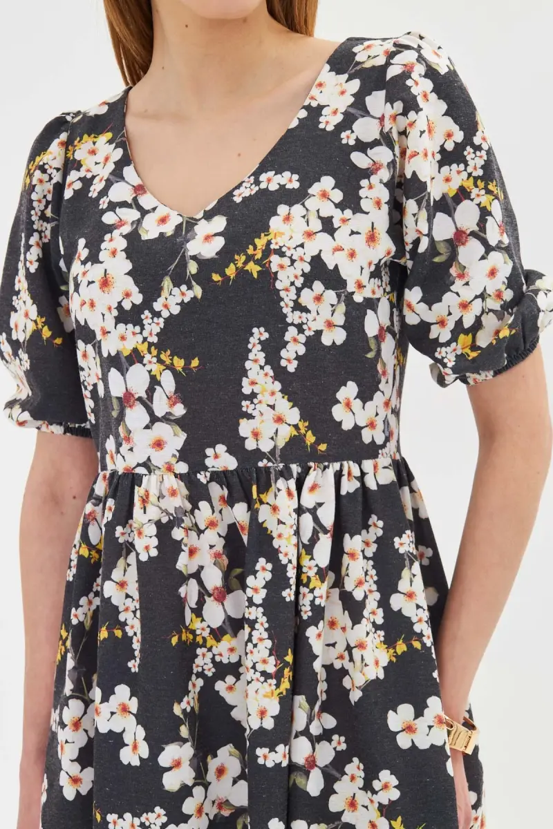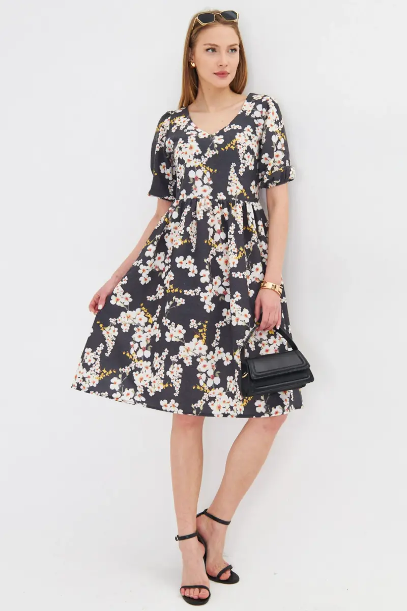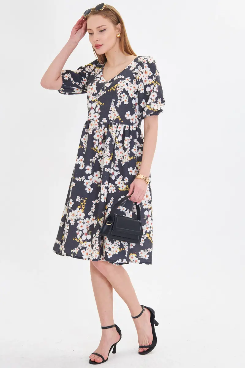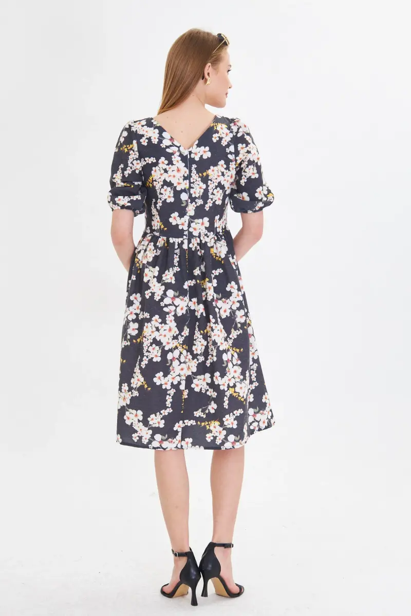 Kadın Sarı U Yaka Kolları Lastikli Beli Büzgülü Midi Boy Elbise ARM-25Y001003-Sarı