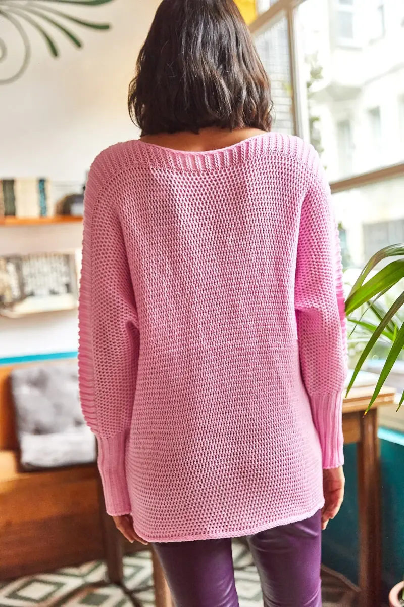 Kadın Şeker Pembe Kol Detaylı Petek Örgü Kazak-Şeker Pembe