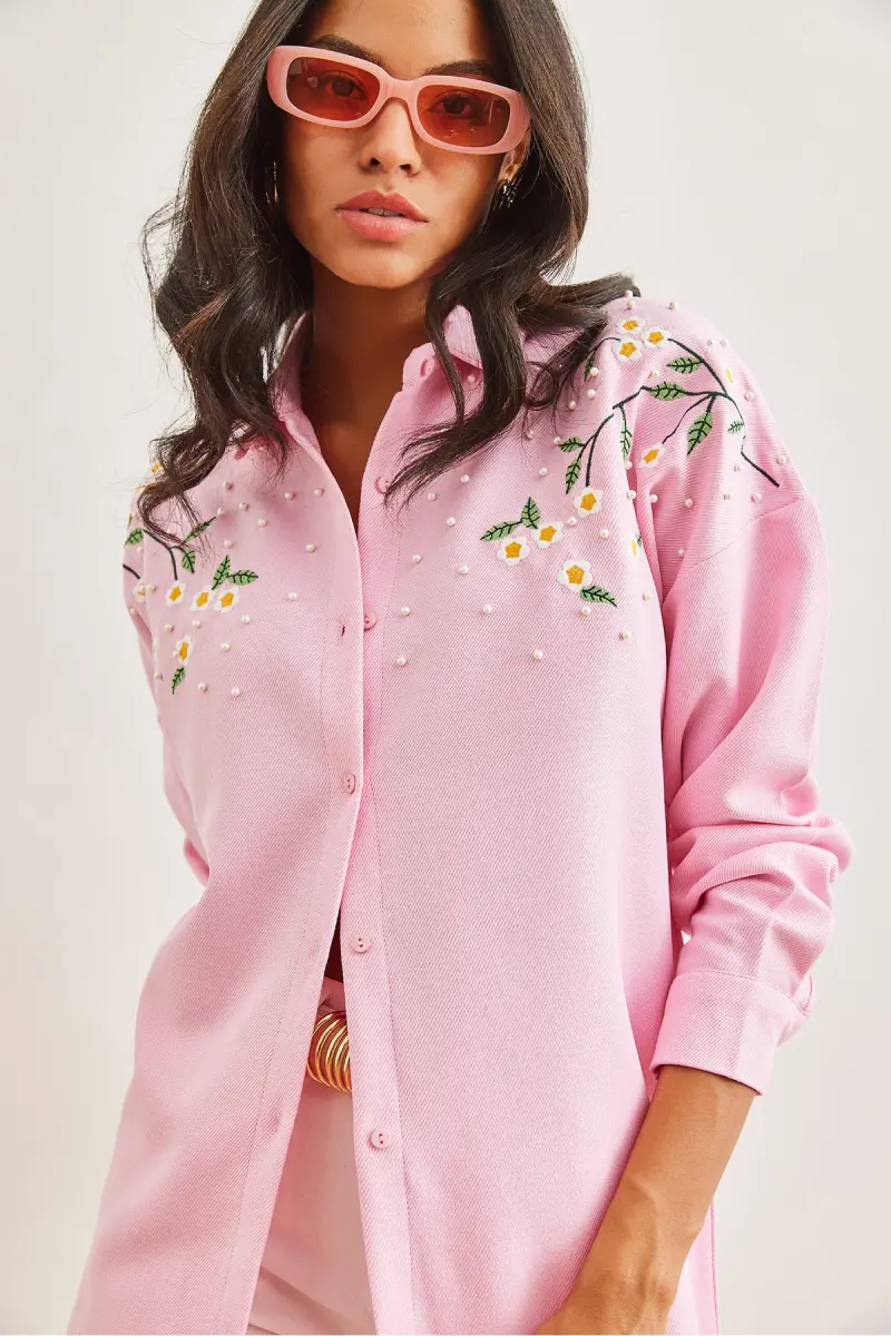 Kadın Şeker Pembe Nakışlı İncili Yün Efektli Oversize Kışlık Gömlek GML-19001159-Şeker Pembe