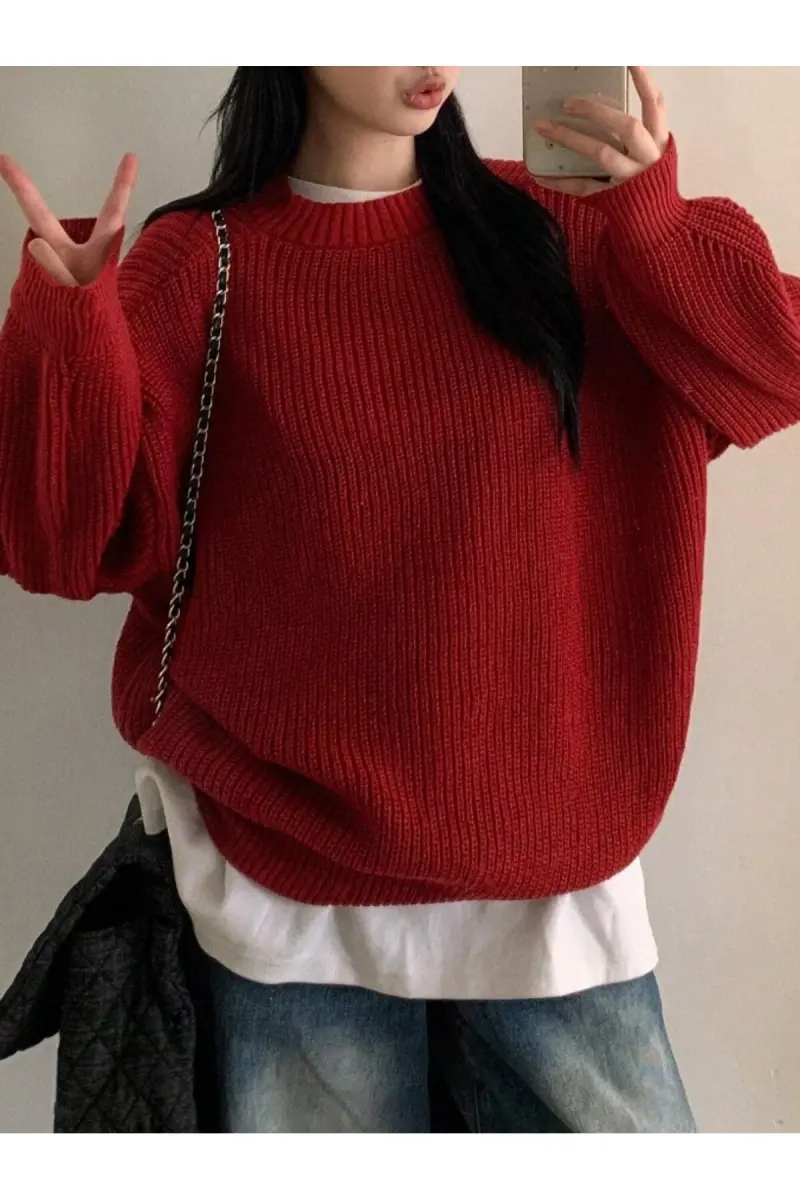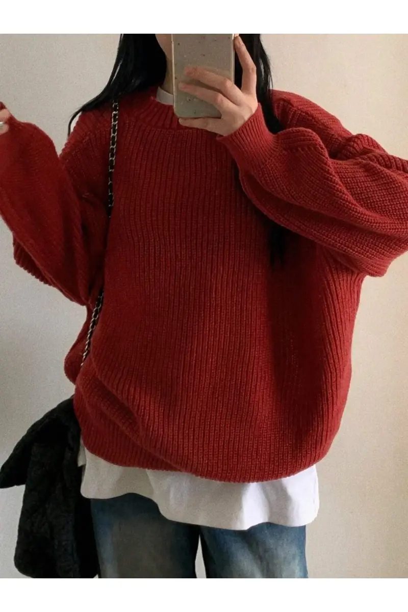 Kadın Selanik Örgü Kırmızı Oversize Kazak, Kadın Kazak-Kırmızı