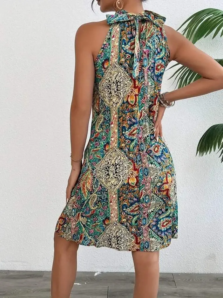 Kadın Sıfır Kol Boyundan Askılı Desenli Midi Süprem Elbise