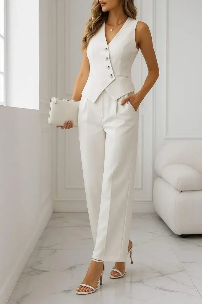 Kadın Sıfır Kollu çapraz V Yakalı önden Düğmeli Atlas Yelek Ve Pantolon Ikili Takım