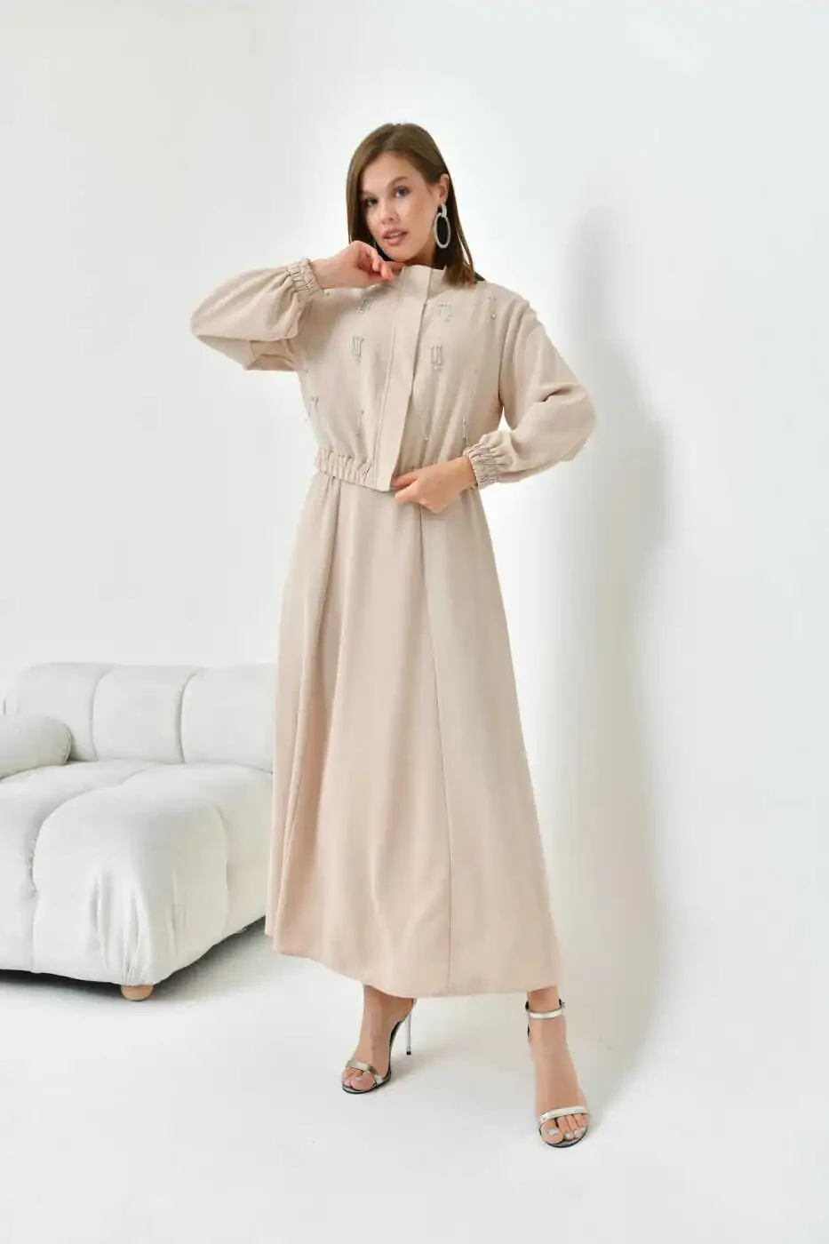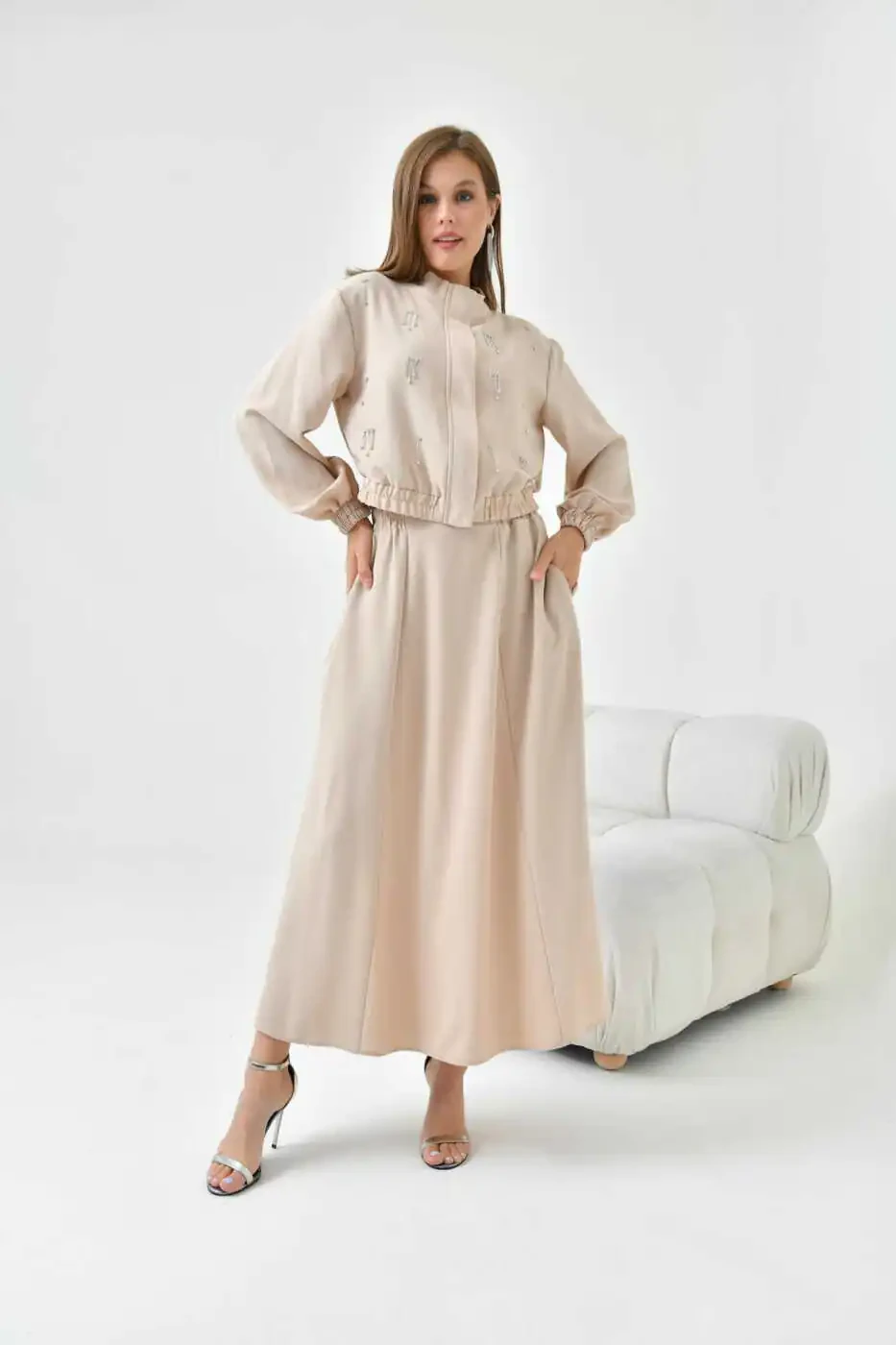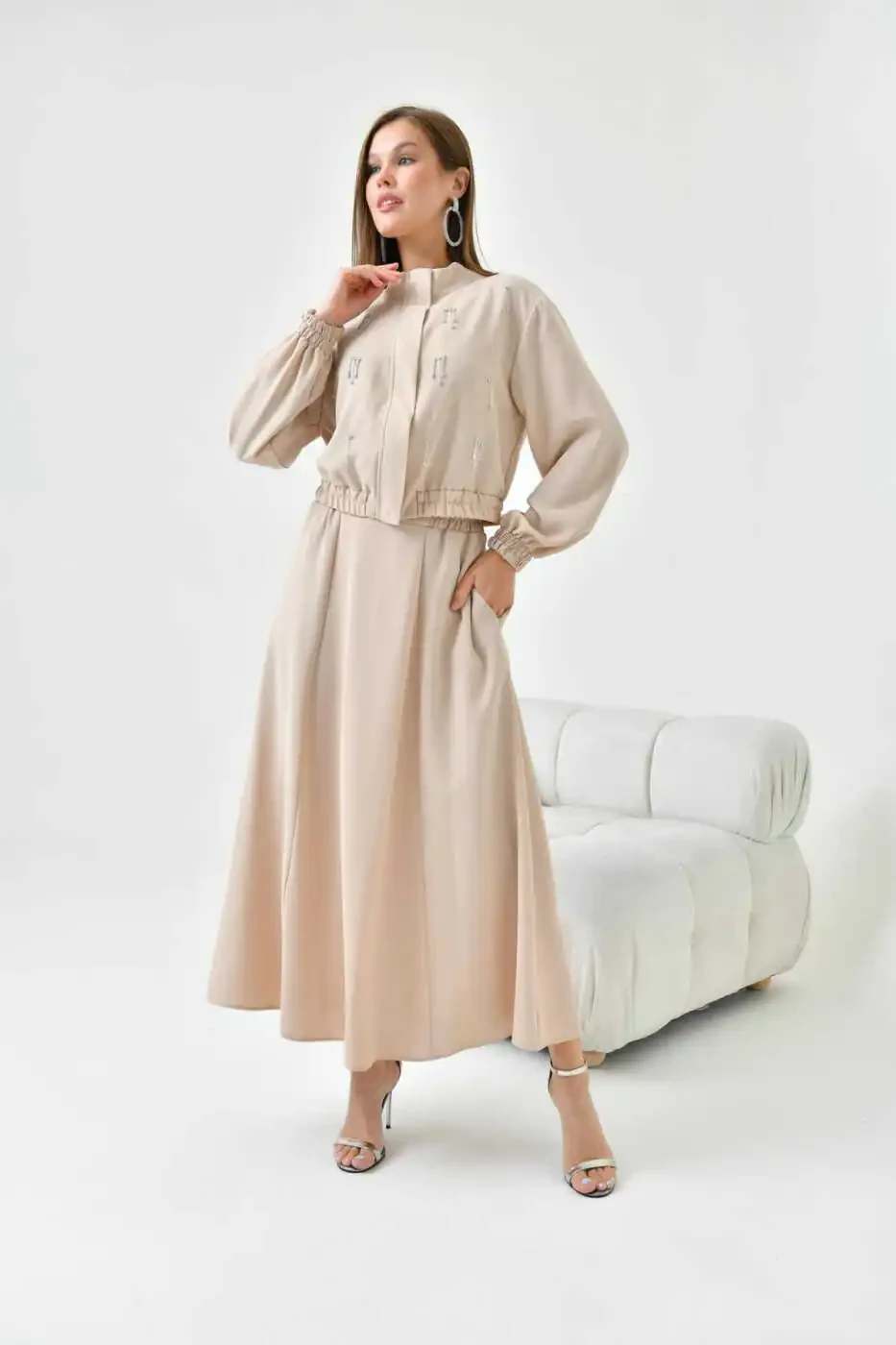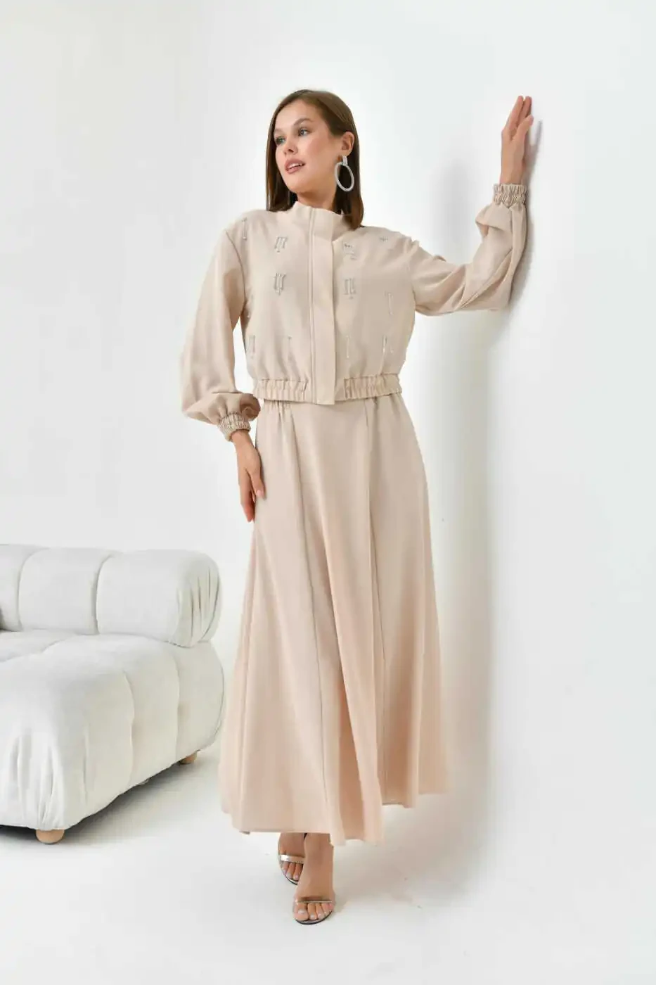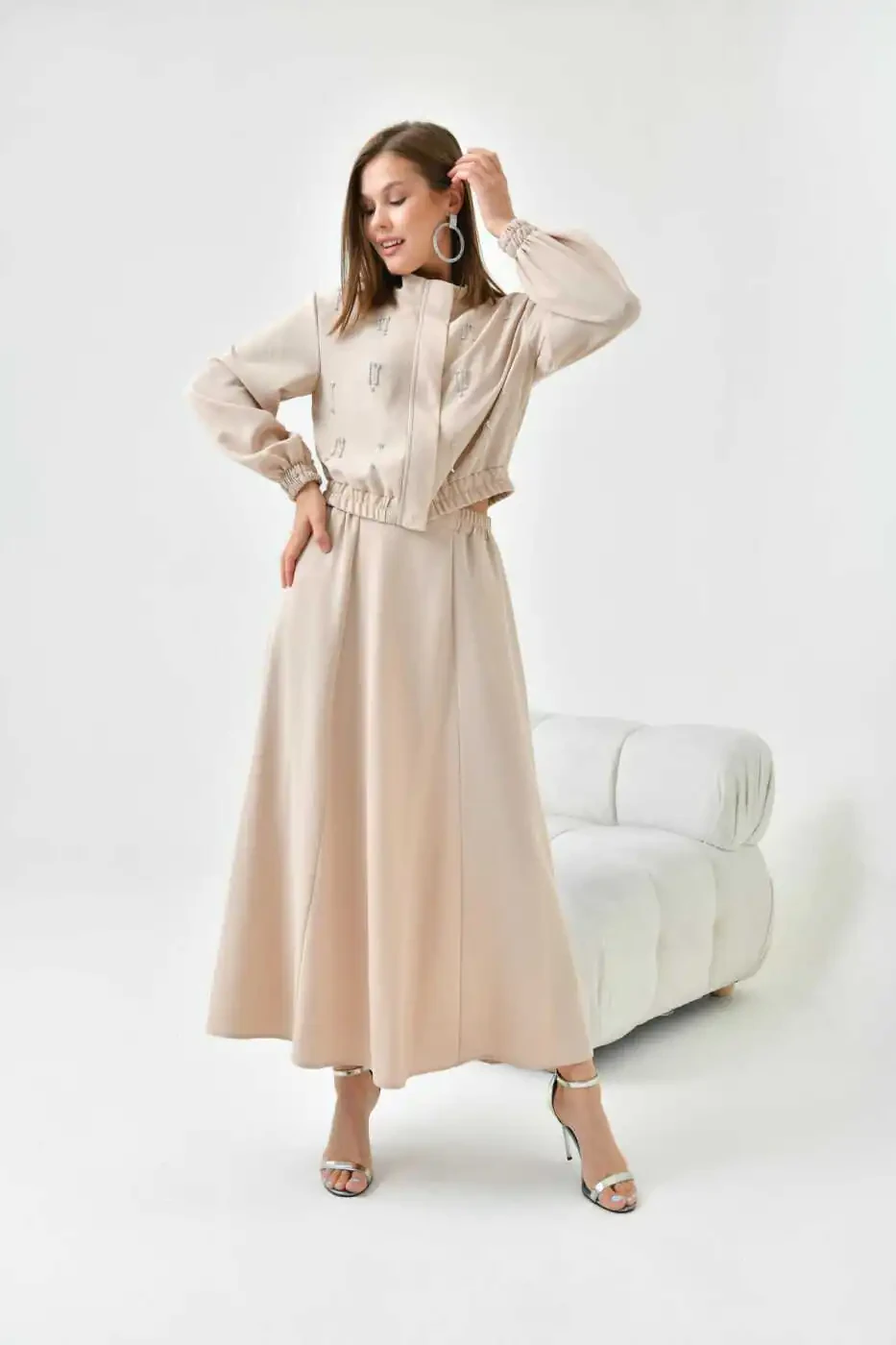 Создайте потрясающий образ с помощью Женского костюма с юбкой из крепа с блестками Бежевый 30839, который сочетает в себе элегантность и стиль. Изготовленный из мягкой и струящейся креповой ткани, этот костюм излучает утонченность, подходящую для любого случая. Блестящие детали с блестками добавляют вашему наряду современный штрих, выделяя вас из толпы.