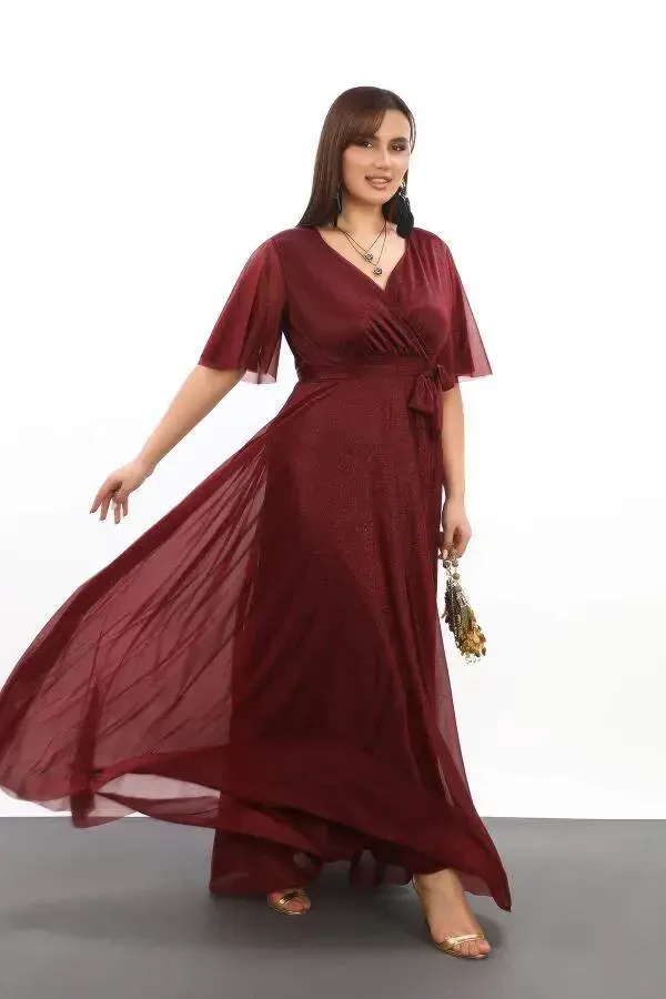 **Women's Glittery Tulle Elastic Crisscross Neck Ruffle Sleeve Long Chic BURGUNDY Evening Dress KL3051**This stunning burgundy evening dress will turn heads at your special occasion. Its long, stretchy tulle fabric provides a perfect fit for every body.**Features:*** **Model Measurements:** * Height: 1.80 m * Weight: 77 kg * Size: 44-46 * Bust: 106 cm * Waist: 87 cm * Hips: 113 cm* **Product Length:** 150 cm* **Fabric:** * Stretchy * Self-glittery* **Fabric Content:** 90% Polyester, 10% Spandex* **Washing Instructions:** See product label.This elegant dress will make you feel chic and glamorous at any special occasion, whether it's a wedding or a formal event. Its stretchy fabric ensures a perfect fit on every body, while the ruffle sleeves add a feminine touch.Make a grand entrance and create unforgettable memories in this gorgeous burgundy evening dress on your special day!