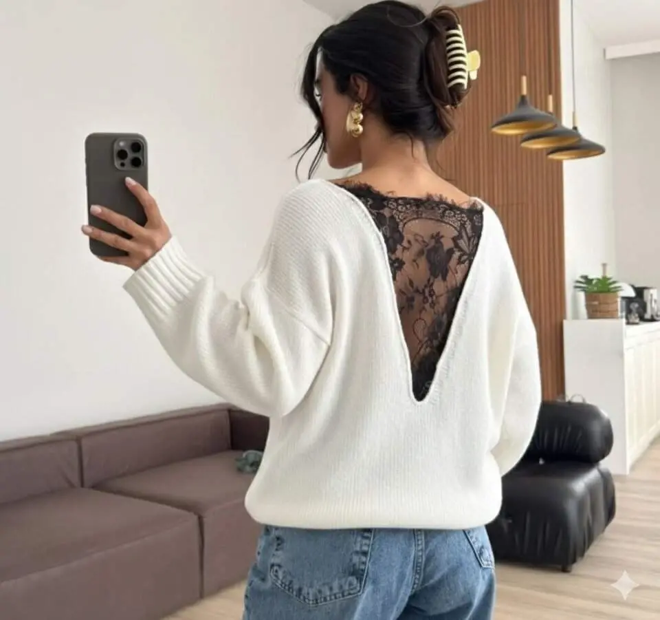 Kadın Sırtı Dantel Transparan Detay Triko Kazak