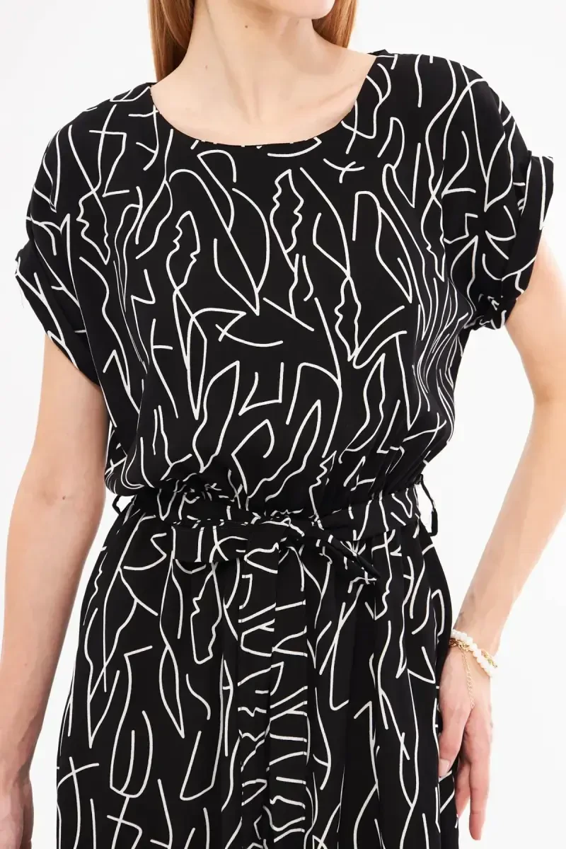 Kadın Siyah-Beyaz Beli Lastikli Bağlamalı Desenli Elbise ARM-22Y001044-Siyah, ARMONİKA'nın özgün tasarımıyla gardırobunuzun vazgeçilmezi olmaya aday. Viskon karışımlı kumaşının sunduğu benzersiz yumuşaklık ve konfor ile gün boyu rahatlığın tadını çıkarın. A-line silueti sayesinde vücut hatlarınızı kusursuz bir şekilde ortaya seren bu elbise, şıklığınızı ön plana çıkarırken hareket özgürlüğünüzden de ödün vermez. Dokuma kumaşının dayanıklılığı ve kaliteli dokusu, uzun ömürlü bir kullanım sunarken, düz deseni sayesinde her türlü aksesuarla kolayca kombinlenebilir. İster günlük kullanımda, ister özel davetlerde tercih edebileceğiniz bu midi boy elbise, her ortamda şıklığınızı konuşturmanızı sağlar. Lastikli bel detayı, belinizi zarifçe vurgulayarak feminen bir görünüm yaratırken, konforlu bir kullanım deneyimi sunar. V yaka tasarımı, zarafetinizi ön plana çıkarırken, standart kol tipi günlük kullanıma uygunluğu ile dikkat çeker. %60 viskoz ve %40 polyester karışımı kumaşı, hem dayanıklılığı artırır hem de kolay ütüleme özelliği sunar. Siyah ve beyazın zamansız uyumuyla tasarlanan bu elbise, şık ve modern bir görünüm elde etmek isteyen kadınlar için ideal bir seçimdir. ARM-22Y001044-Siyah modeli, gardırobunuzun en sevilen parçası olmaya hazır. Bu elbise ile hem rahatlığın hem de şıklığın keyfini çıkarın. İster topuklu ayakkabılarla özel bir davete katılın, ister sandaletlerle günlük bir gezintiye çıkın, bu elbise her durumda size eşlik edecektir. Kendinizi özel hissetmek ve stilinizi yansıtmak için bu benzersiz tasarımı kaçırmayın.