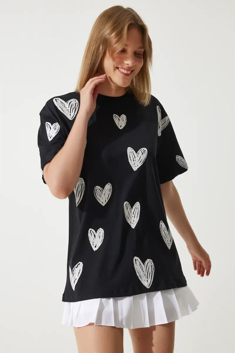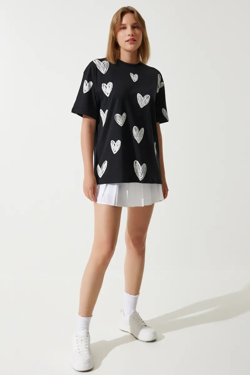 Kadın Siyah Beyaz Kalp Baskılı Oversize Pamuklu T-Shirt BP00165-Siyah Beyaz