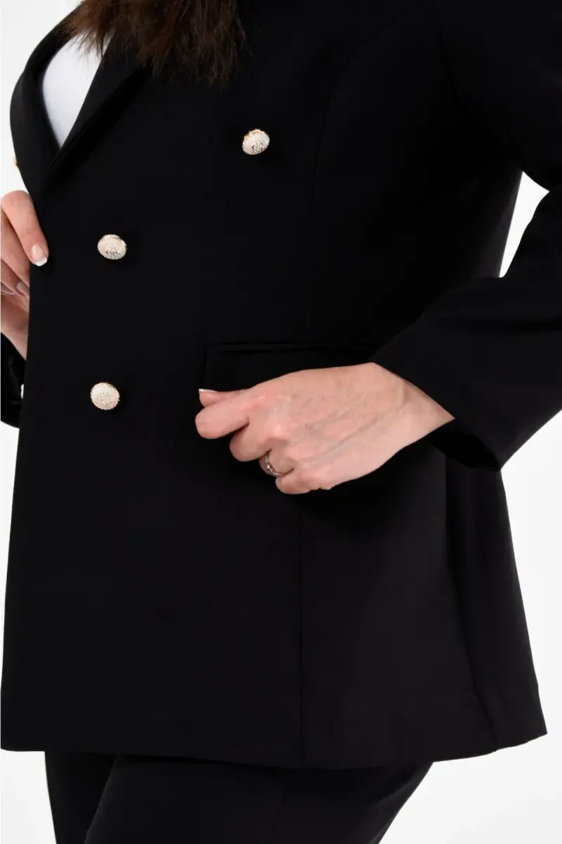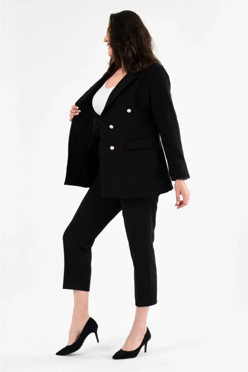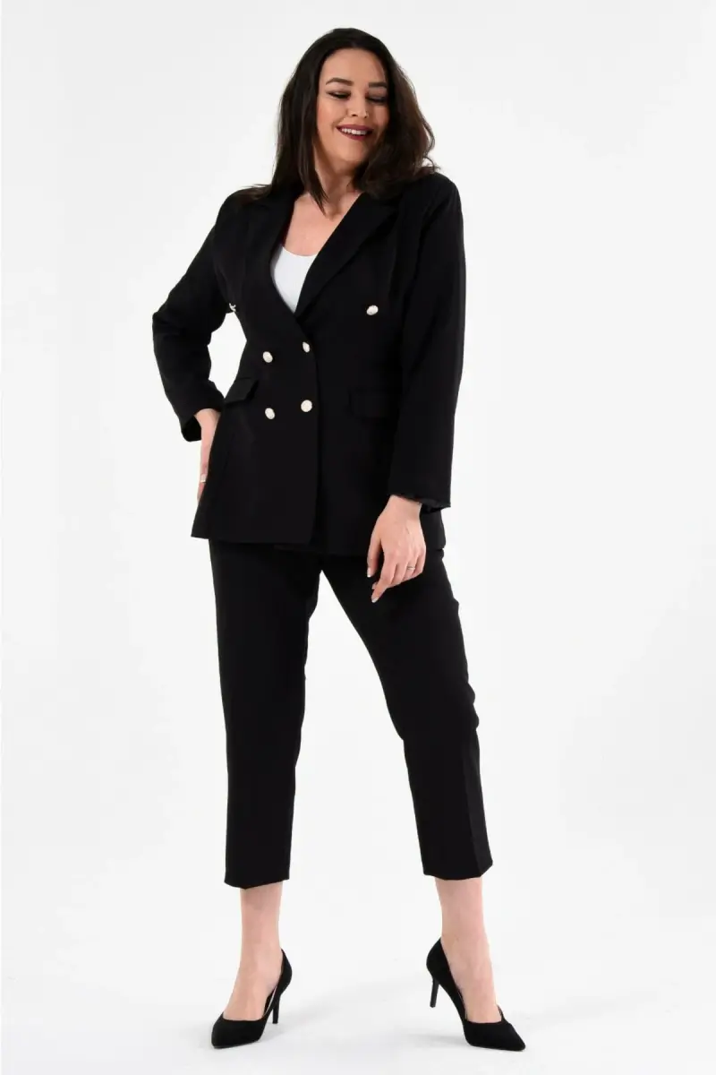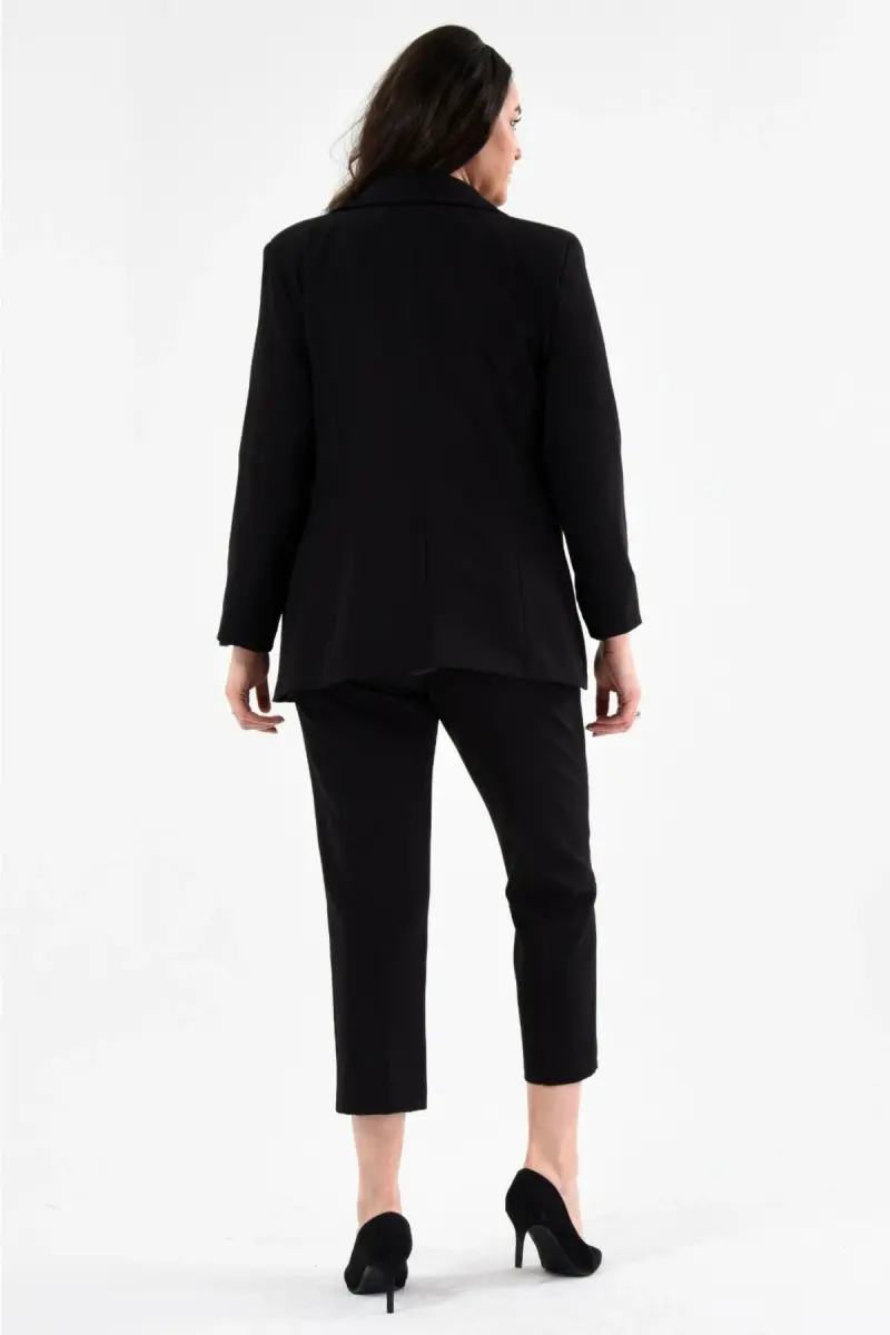 Kadın Siyah Blazer Ceket Kemerli Cepli Boru Paça Pantolon Büyük Beden Takım Elbise-Siyah