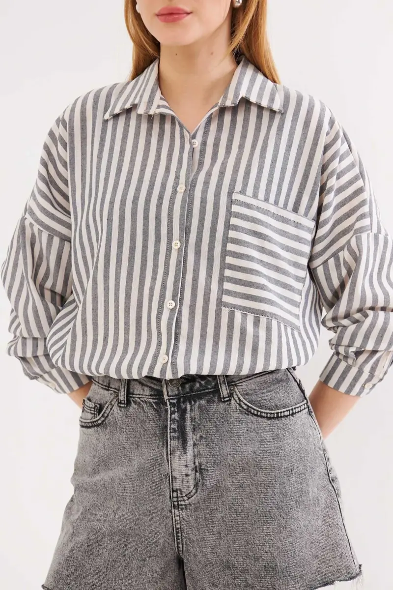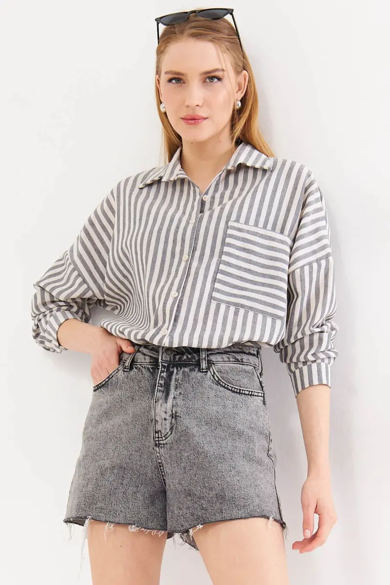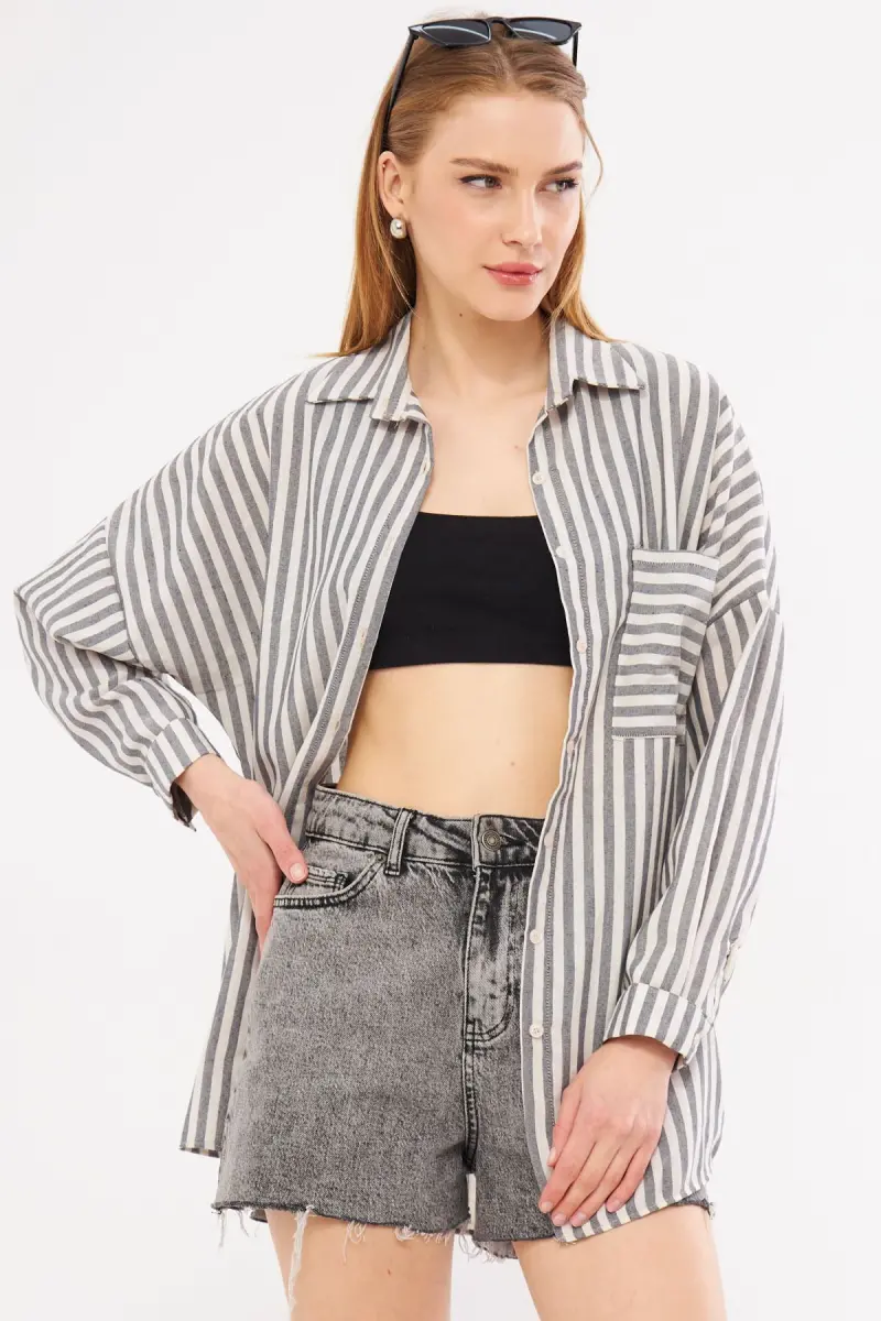 Kadın Siyah Çizgili Uzun Kol Cep Detaylı Pileli Oversize Gömlek ARM-24Y001057-Siyah