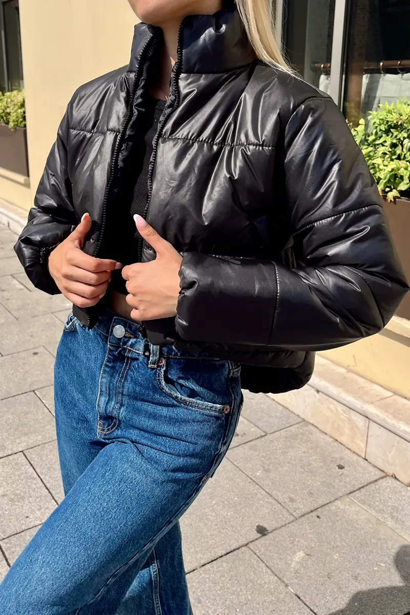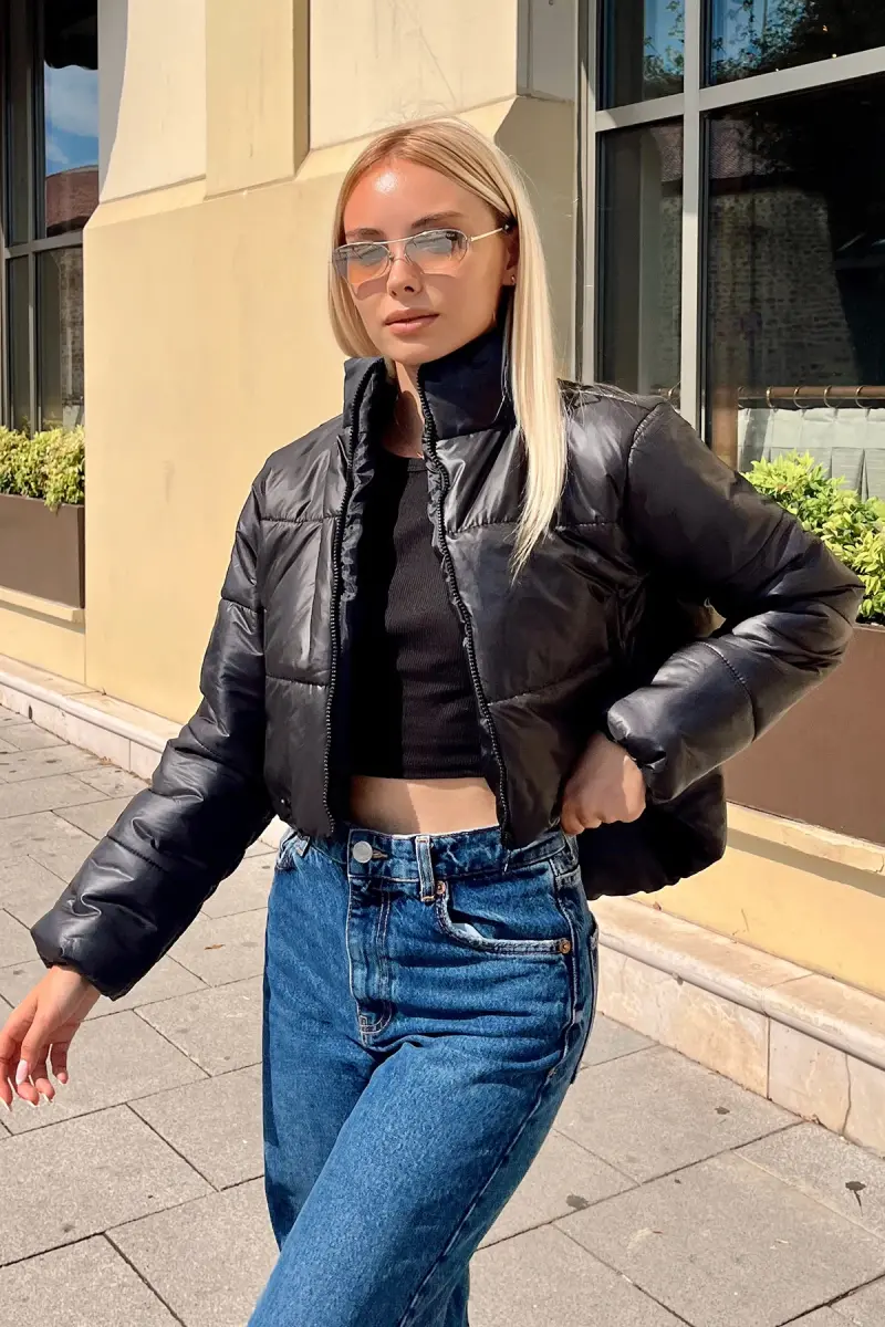 Kadın Siyah Dik Yaka Çift Cepli Beli Lastikli Şişme Puffer Mont ALC-X7684-SİYAH