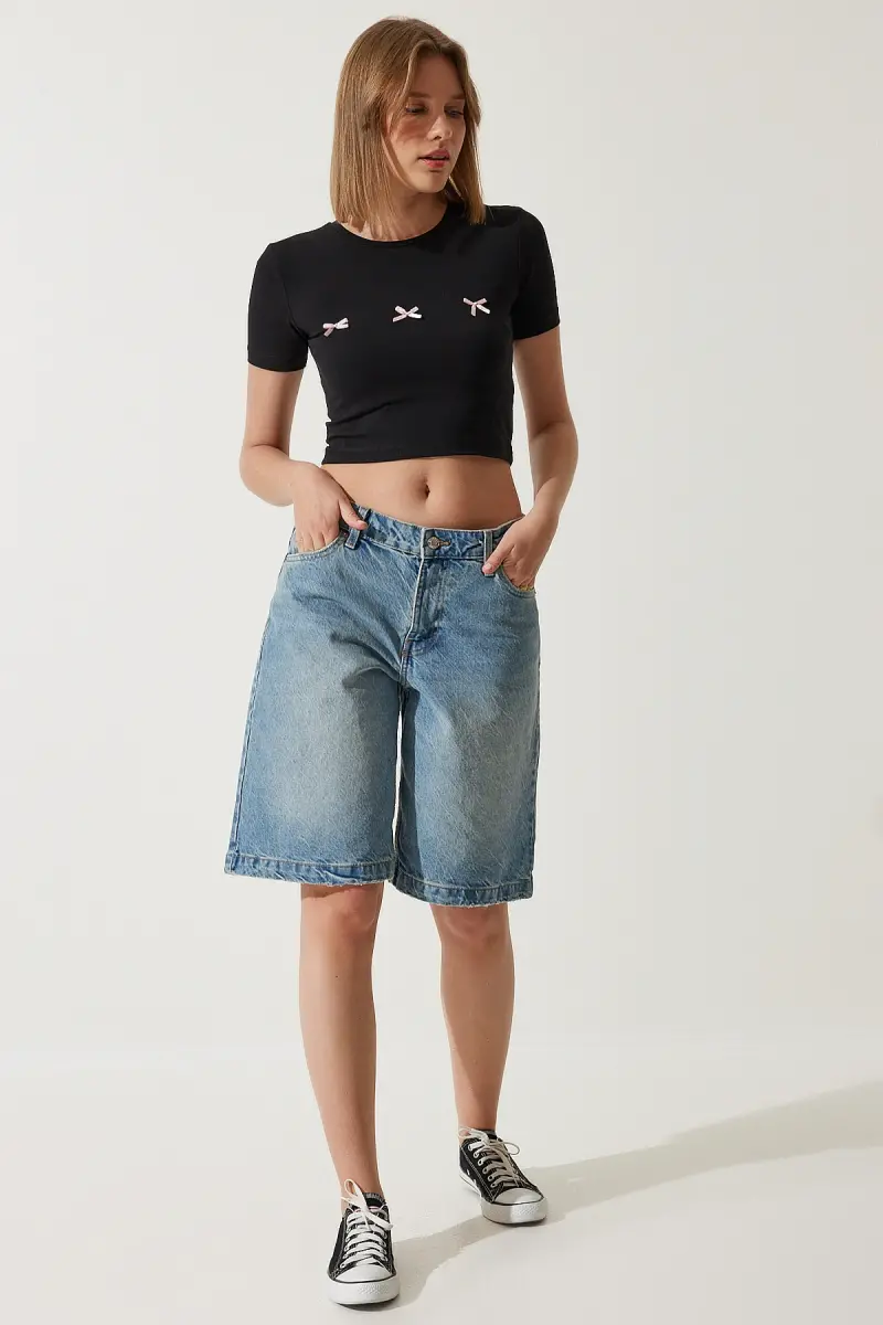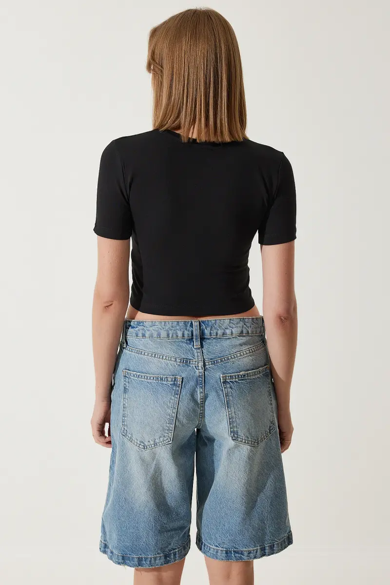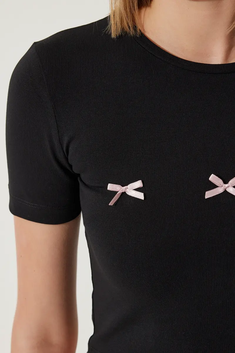 Kadın Siyah Fiyonk Detaylı Crop T-Shirt MC00279-Siyah