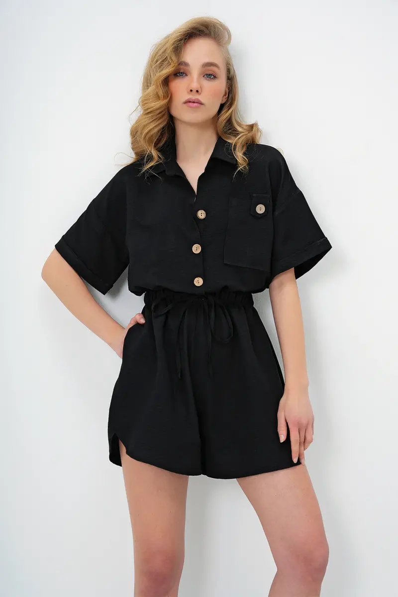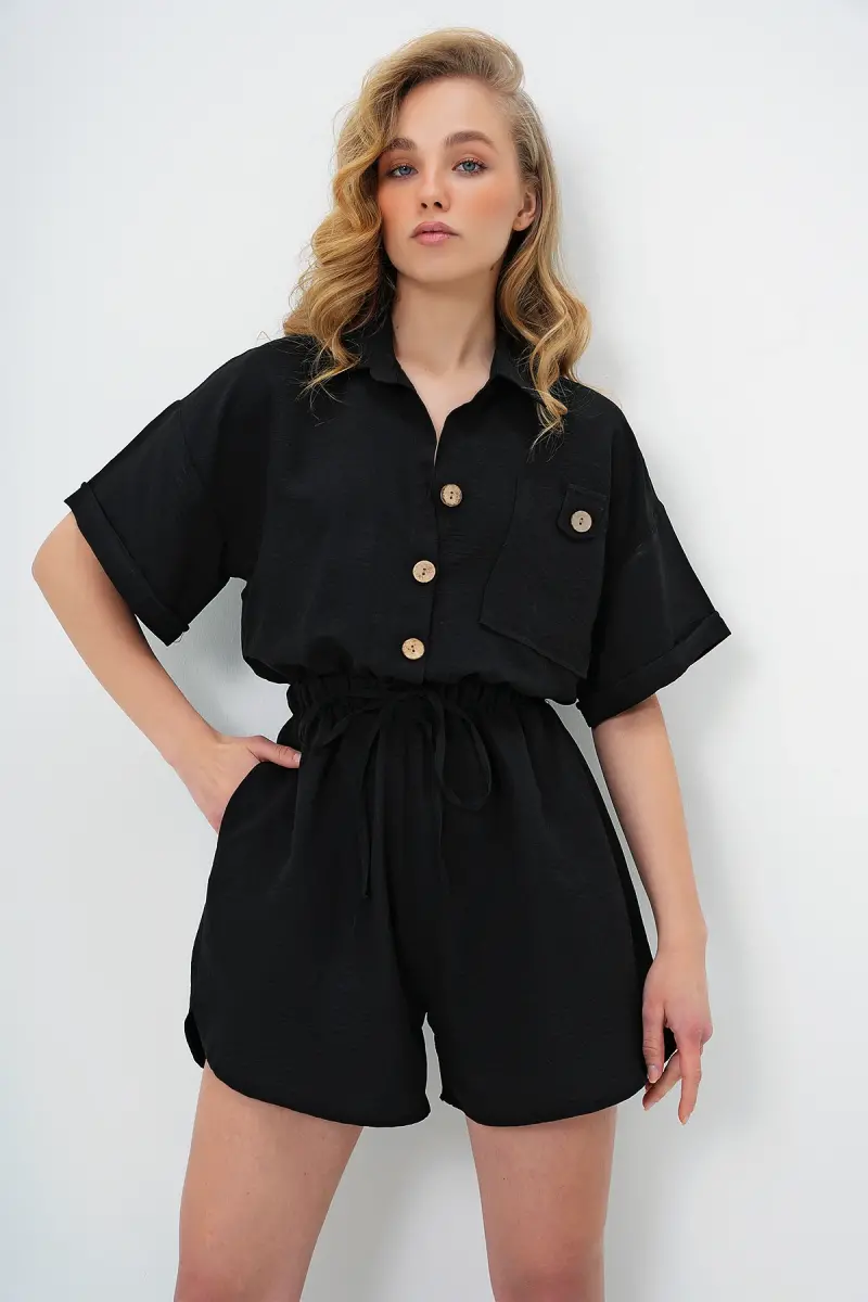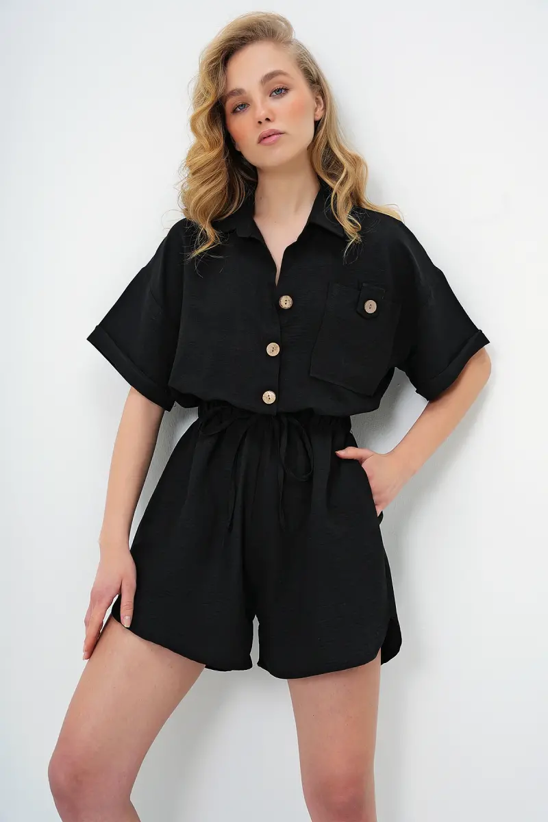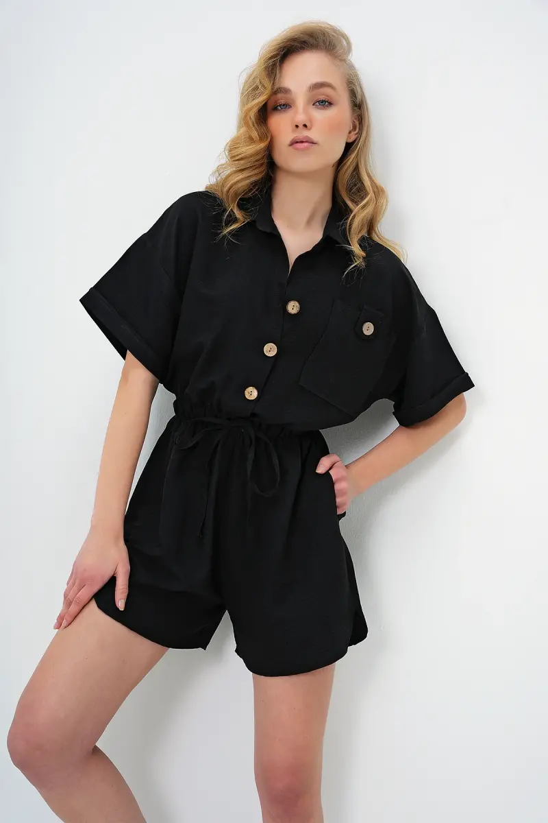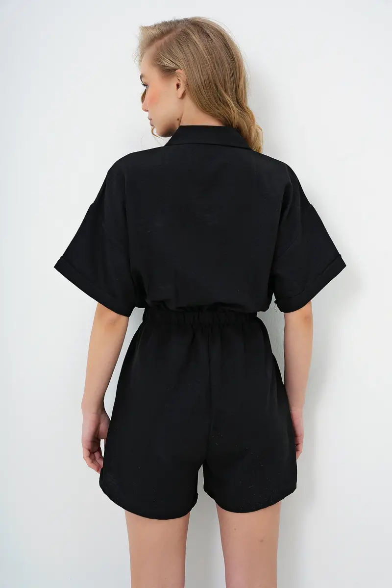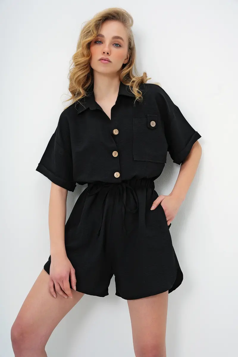 Kadın Siyah Gömlek Yaka Çift Cepli Şort Tulum ALC-X11611-SİYAH
