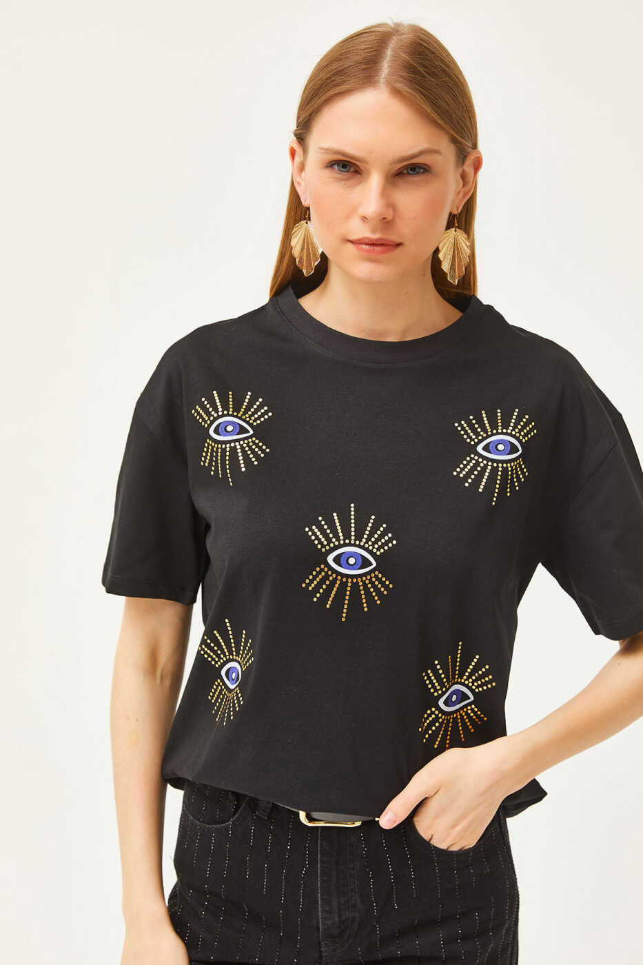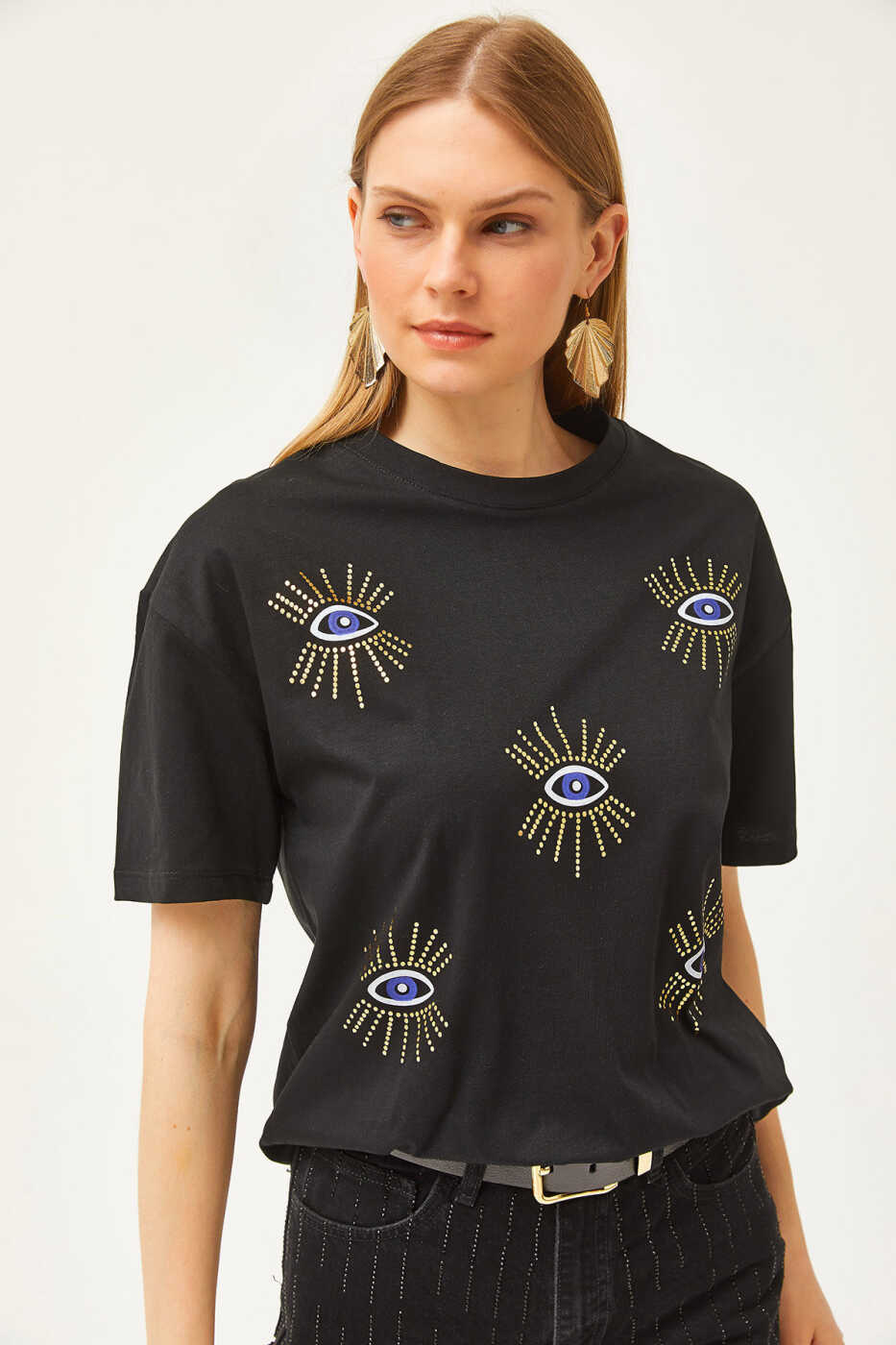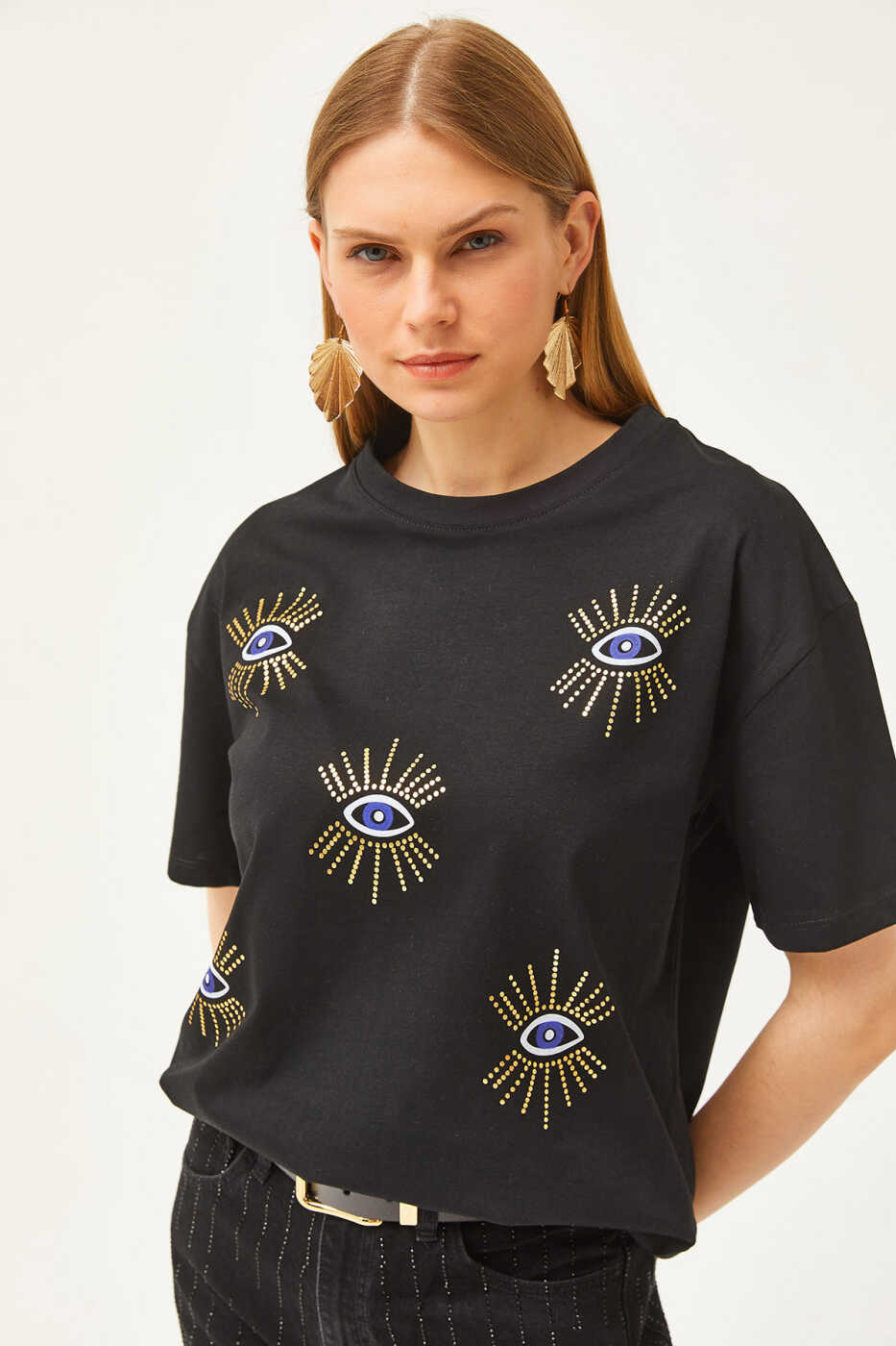 Şıklığı ve rahatlığı bir araya getiren, kadınlara özel tasarlanmış TSH-19000770 siyah göz baskılı varak detaylı tişört, gardırobunuzun vazgeçilmez parçalarından biri olacak. Yumuşak ve nefes alan kumaşıyla gün boyu konfor sunan bu tişört, zarif varak detaylarıyla da göz alıcı bir görünüm kazandırıyor. Siyah rengin zamansız şıklığına, göz baskısının gizemli ve çekici duruşu eşlik ediyor.