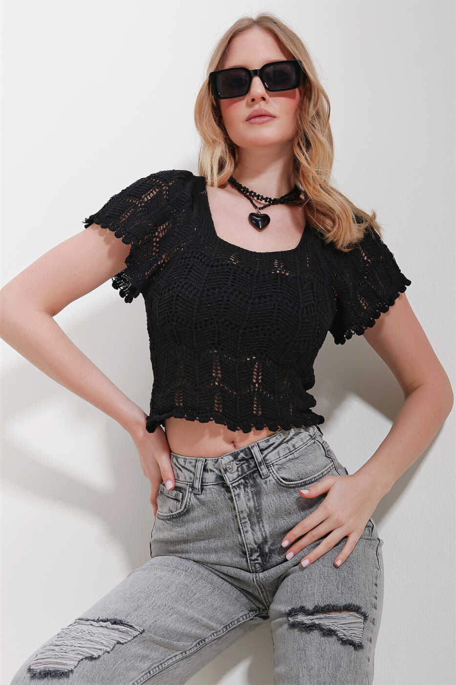 You can combine the Women's Black Square Neck Lace Trim Knit Blouse with jeans, skirts or shorts. When you complete it with a blazer jacket and heels, you will have a stylish and sophisticated look.