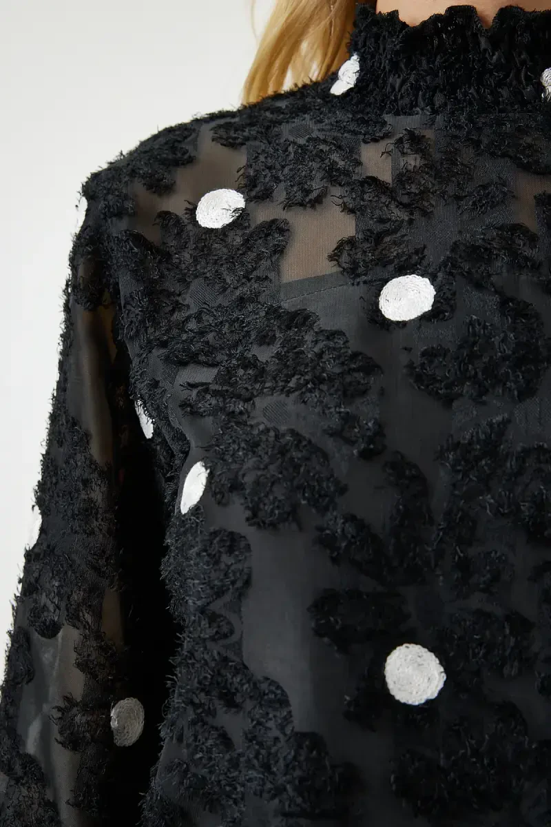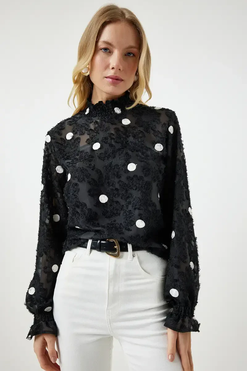 Get ready to make a difference in your wardrobe with the Women's Black Mottled Polka Dot Woven Blouse TP00020-Black! This stylish and elegant blouse will make you the center of attention in any environment. This special design offered with Trendyol assurance stands out with its modern details and comfortable cut. This blouse, which will accompany you from daytime elegance to evening invitations, offers versatile use. Thanks to the buttoned closure detail, you can easily put it on and take it off, and enjoy comfort at any time of the day. Mottled polka dot weave helps you create a unique style by making the blouse stand out from the ordinary. The long-sleeved design is an ideal choice for seasonal transitions, while the woven fabric type offers long-lasting use. The fact that the blouse is made of 100% polyester material provides both lightness and durability advantages. Thanks to its easy care, you can save time and ensure that your blouse always looks like the first day. The regular size cut provides a perfect fit to your body lines, creating a stylish and comfortable silhouette. This blouse, which is part of the Design collection, will be an indispensable piece for women who closely follow trends. The Women's Black Mottled Polka Dot Woven Blouse, which will complement your elegance in daily combinations or special occasions, is a candidate to be one of the most loved pieces of your wardrobe. Reflect your style with this blouse and shine with confidence in any environment. Take advantage of the campaign price and add this unique piece to your cart now and enjoy the pleasure of elegance.