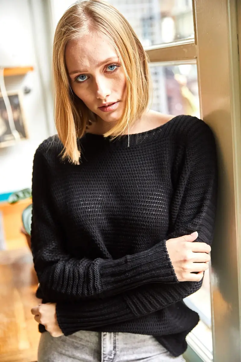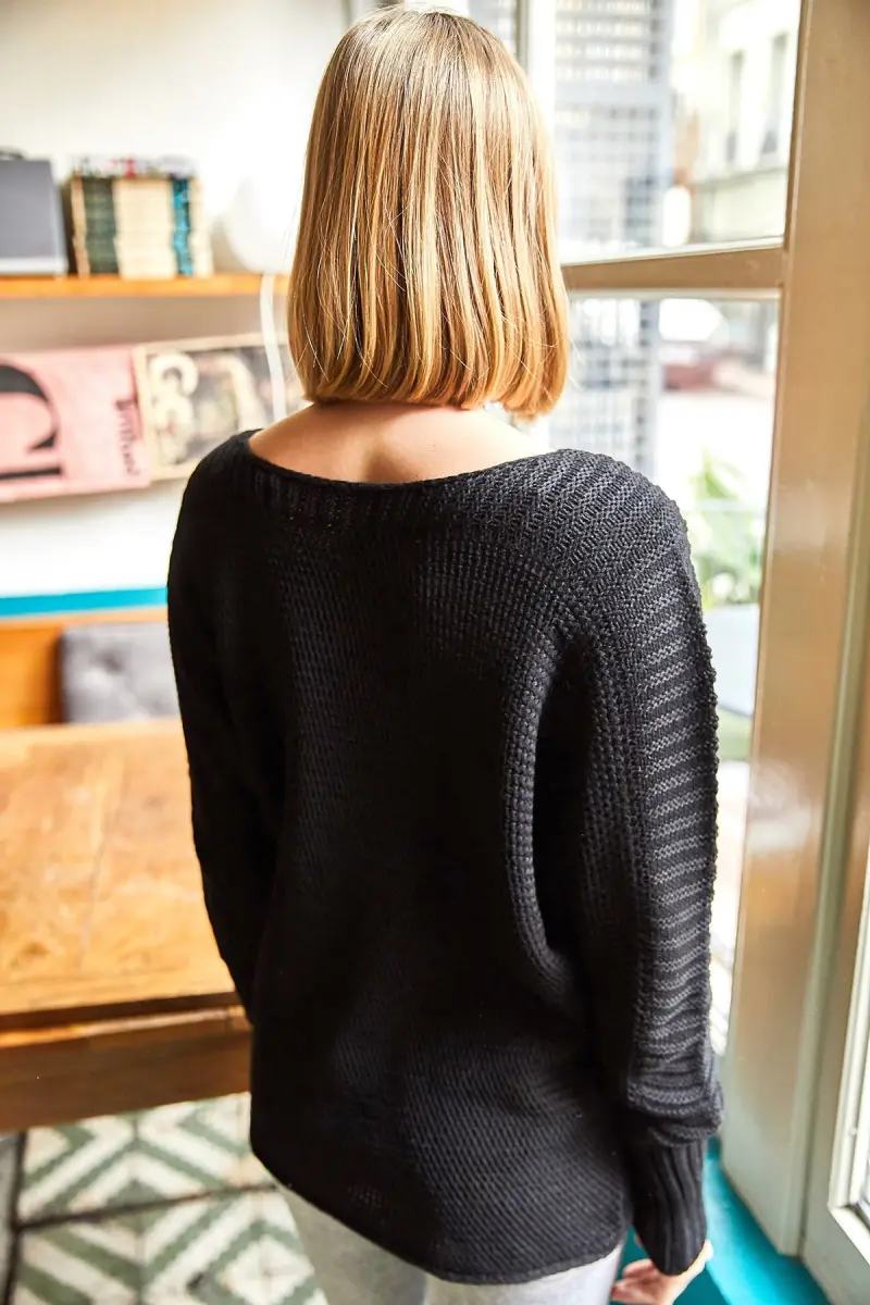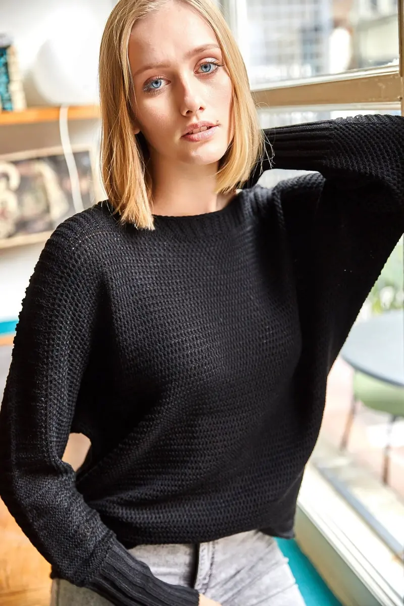 Kadın Siyah Kol Detaylı Petek Örgü Kazak KZK-19000399-Siyah