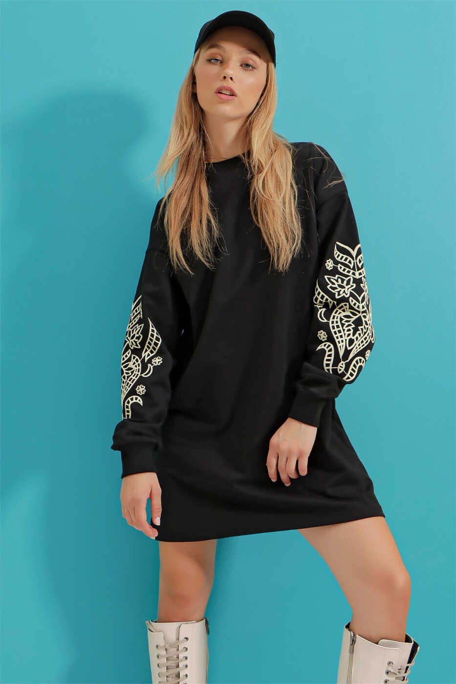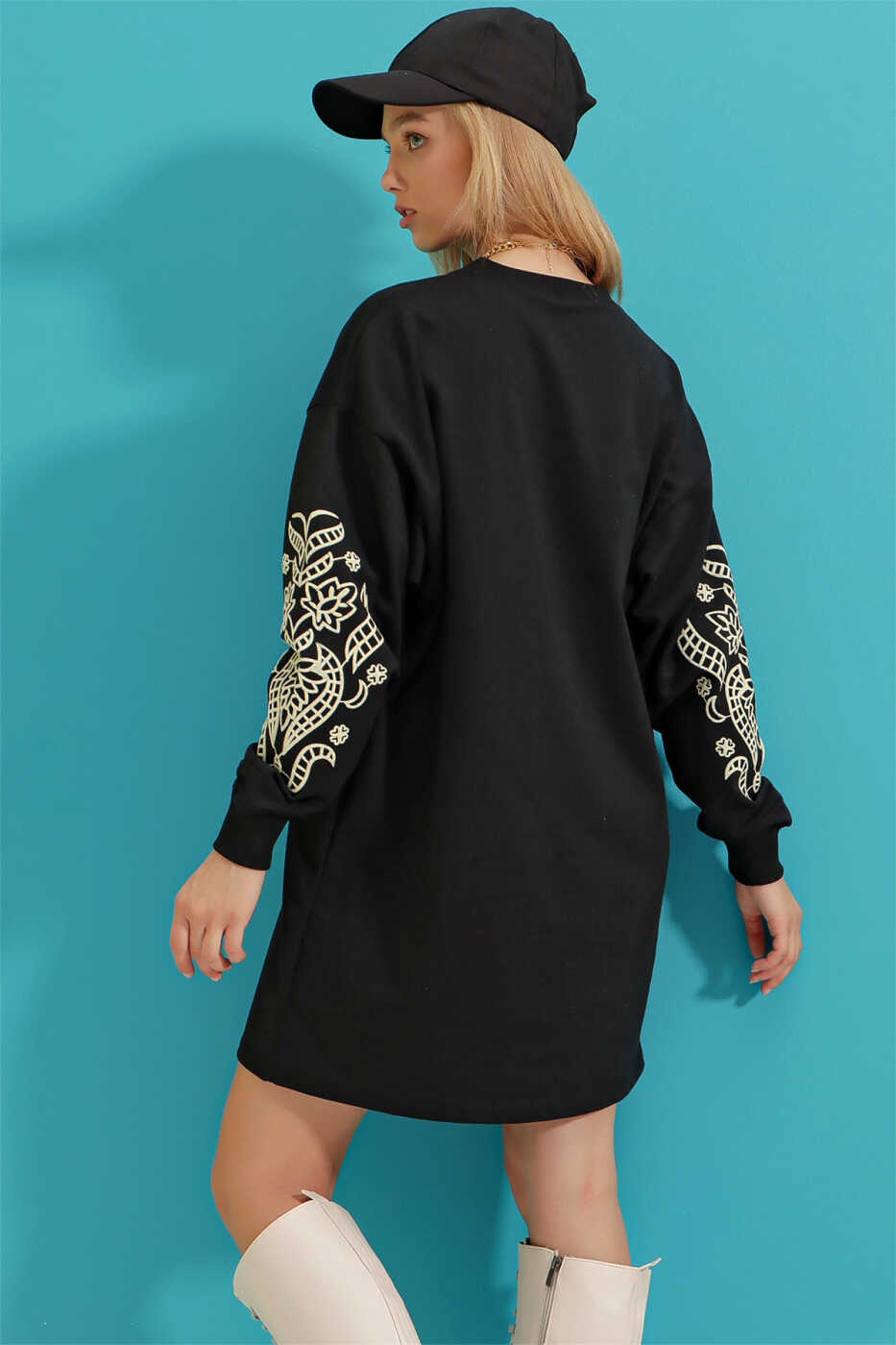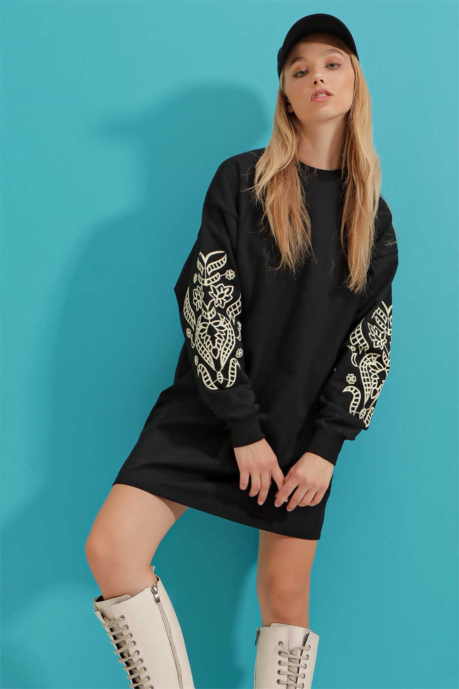 Kadın Siyah Kolu Nakış Baskılı Sweat Elbise ALC-X3095 ile hem rahatlığı hem de şıklığı yakalayın!