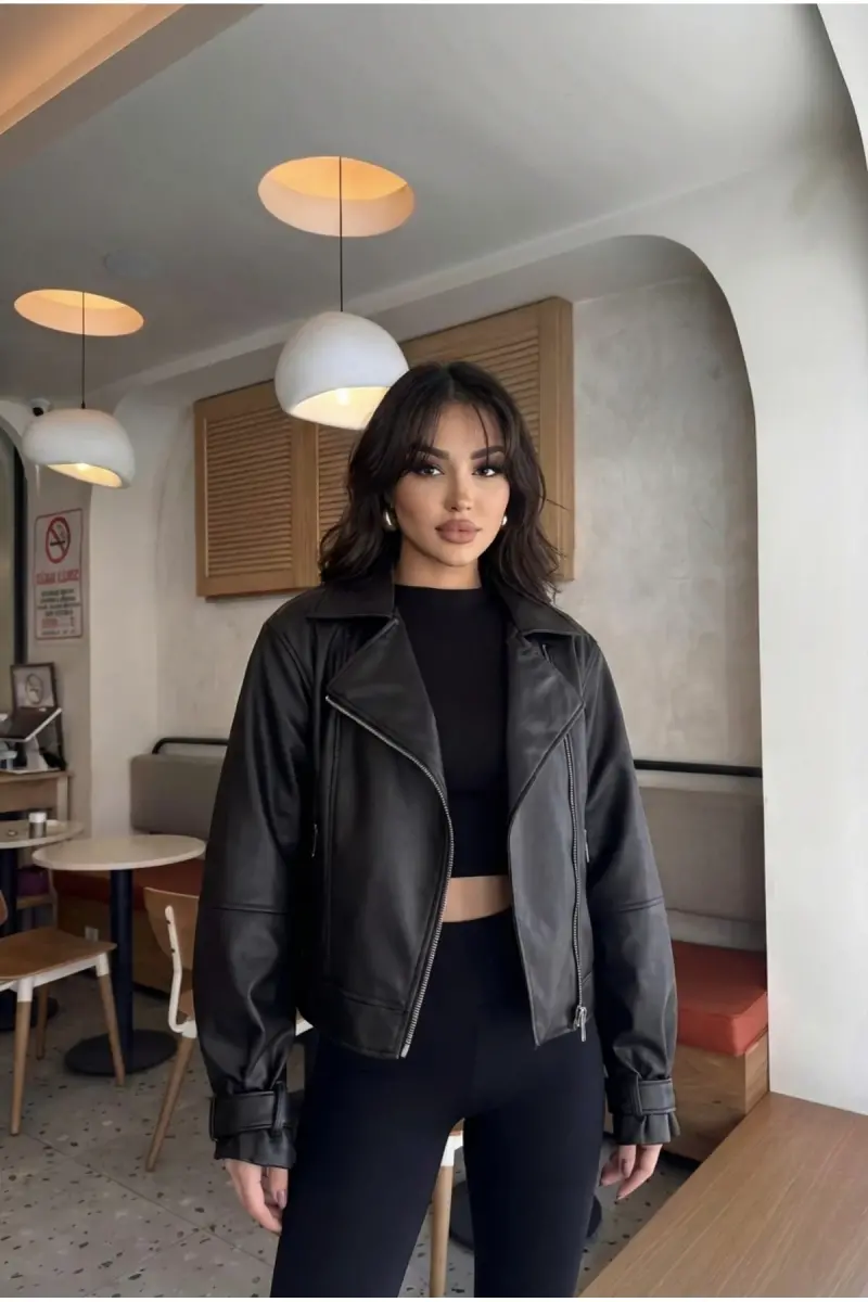 Kadın Siyah Oversize Deri Ceket-Siyahh