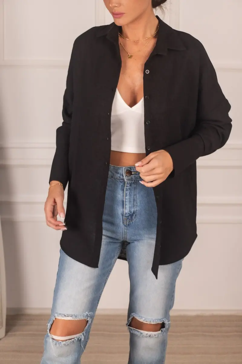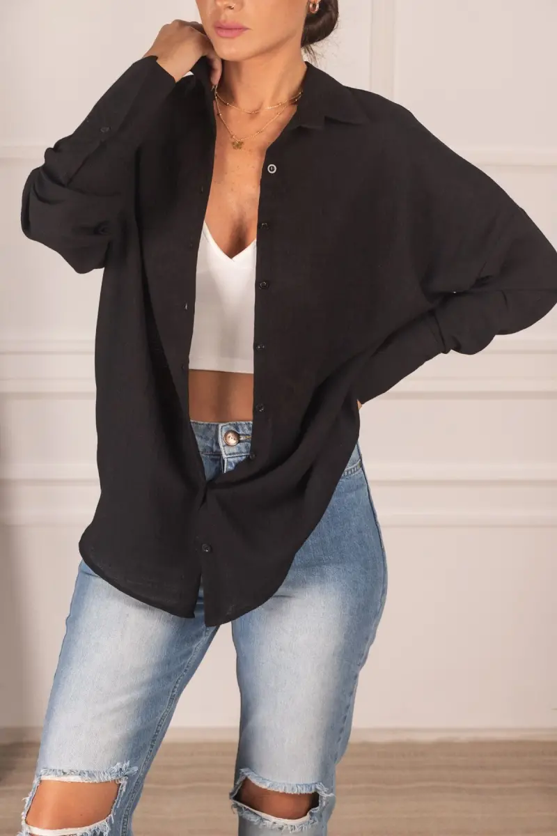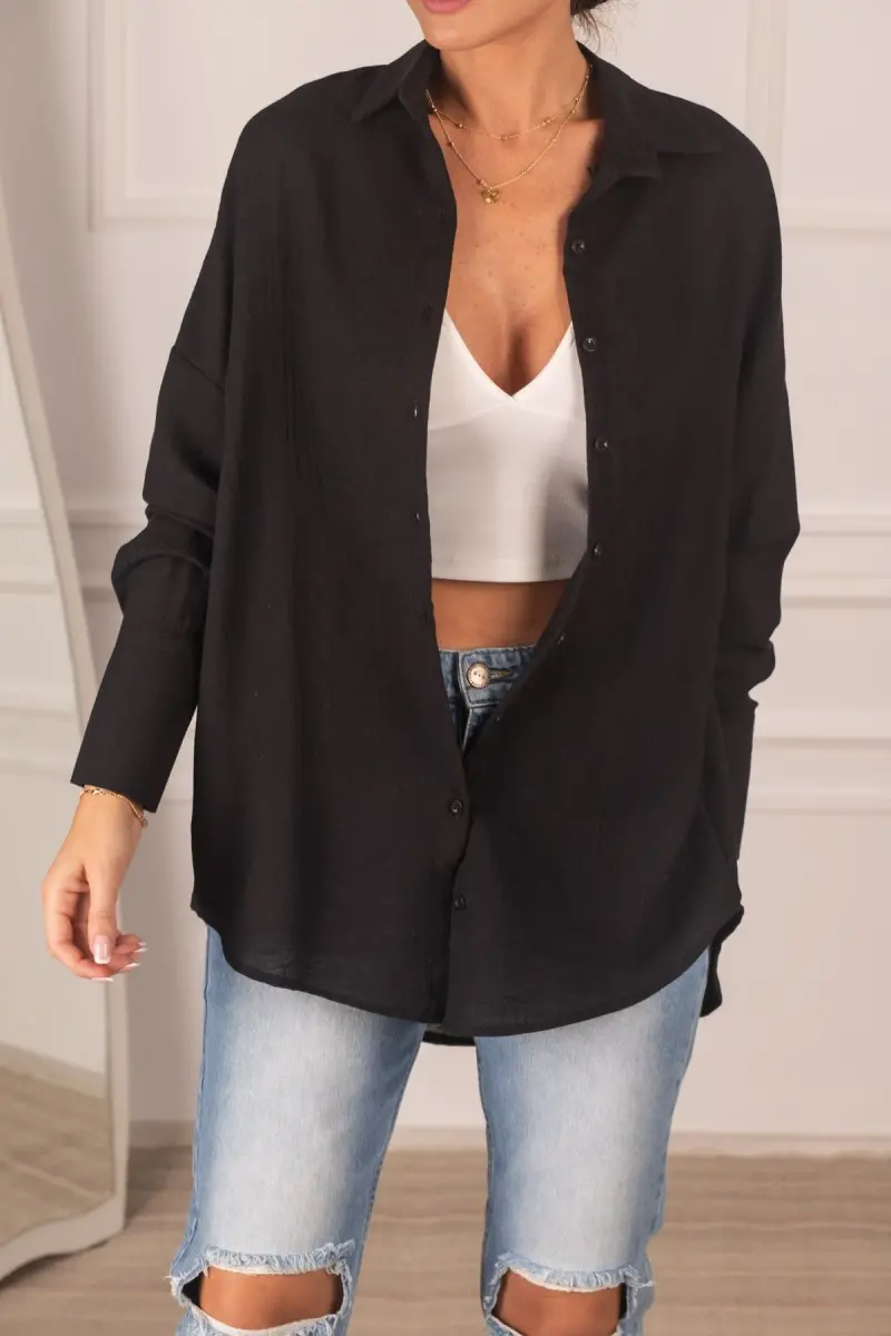 Kadın Siyah Oversize Dokulu Keten Görünümlü Geniş Manşetli Gömlek Arm-24k001001-Siyah
