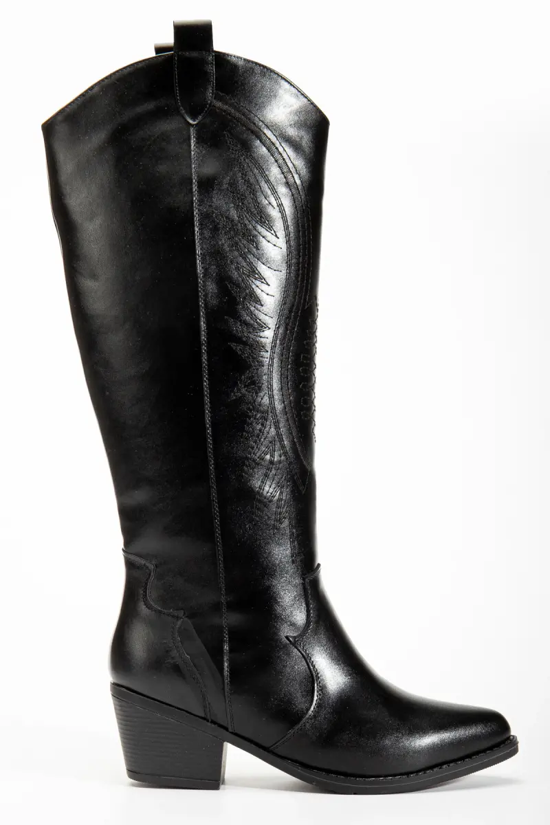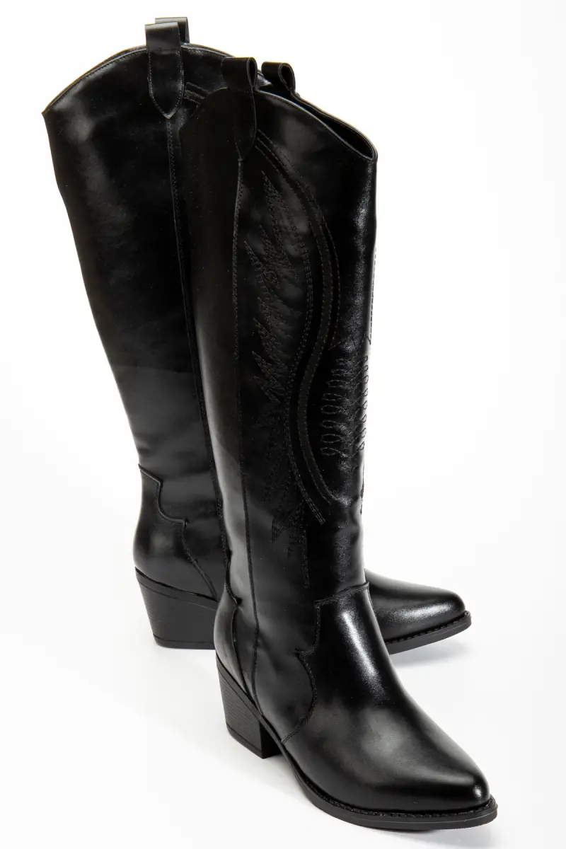 Kadın Siyah Parlak Cilt Nakışlı Western Kovboy Cowgirl Bot Çizme-Siyah Parlak