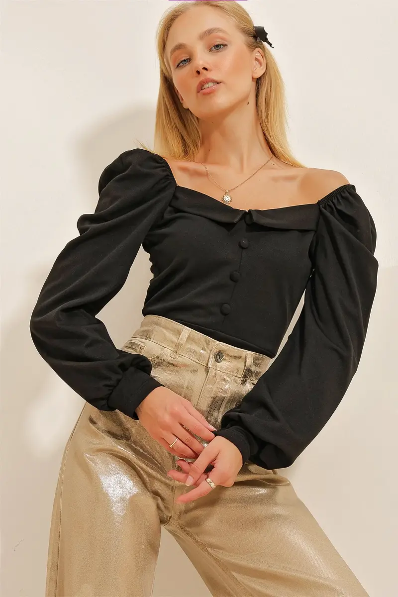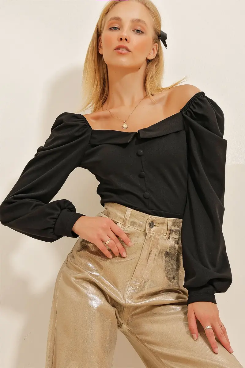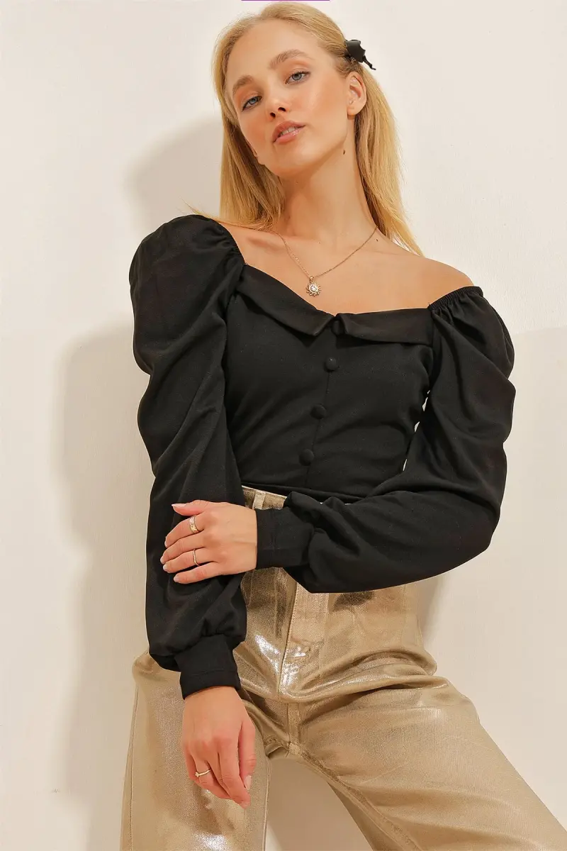 Kadın Siyah Prenses Kol Önü Düğme Detaylı Crep Bluz Alc-X10867-Siyah