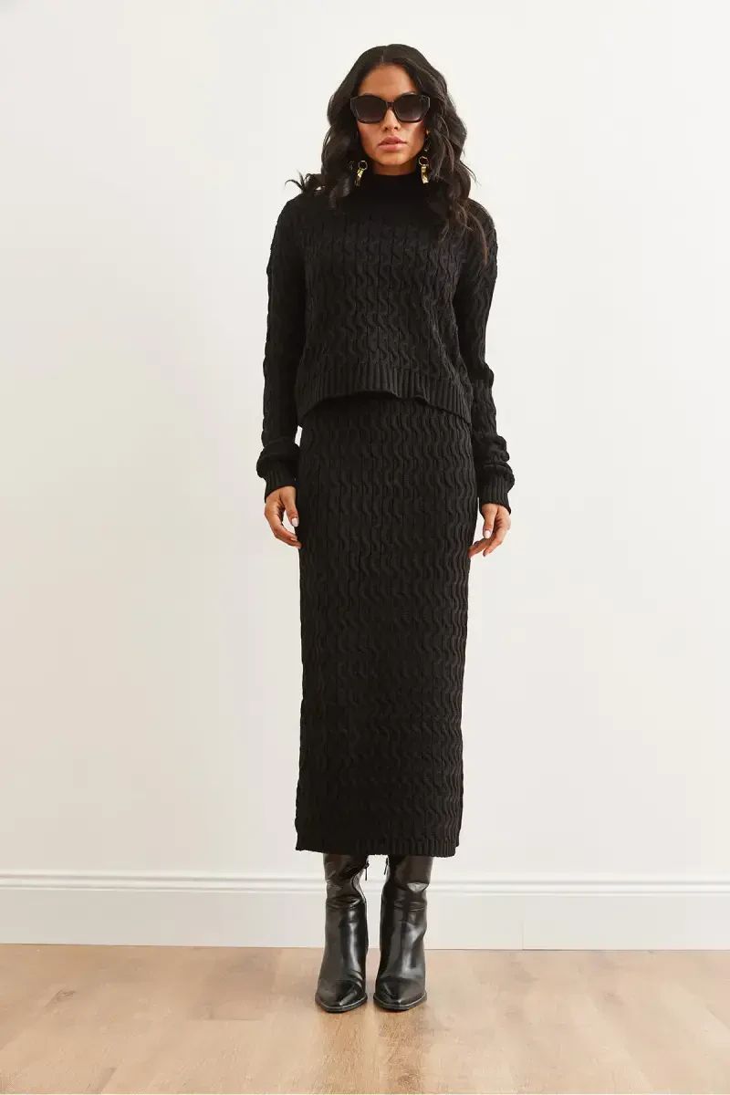 Kadın Siyah Saç Örgü Alt Üst Triko Takım TKM-19000315-Siyah ile şıklığı ve konforu bir arada yaşayın! Bu özel tasarım triko takım, mevsimlik kullanıma uygun yapısıyla gardırobunuzun vazgeçilmezi olacak. Siyahın asaletini saç örgü deseniyle buluşturan bu takım, hem günlük kullanımda hem de özel anlarda size eşlik edecek. Üst ve alt parçadan oluşan bu takım, triko kumaşın yumuşaklığı sayesinde gün boyu rahat etmenizi sağlar. Vücuda oturan kesimiyle şık bir silüet oluştururken, hareket özgürlüğünüzü de kısıtlamaz. Saç örgü deseni, takıma farklı bir hava katarak sıradanlıktan uzaklaşmanızı sağlar. Bu takım, farklı kombinasyonlarla kullanıma da oldukça uygundur. Üst parçayı jean veya etekle kombinleyerek günlük şıklık yaratabilir, alt parçayı ise farklı bluzlarla tamamlayarak daha spor bir görünüm elde edebilirsiniz. Aksesuarlarınızla da tarzınızı yansıtabilir, şık bir kolye veya küpeyle takımı tamamlayabilirsiniz. Kadın Siyah Saç Örgü Alt Üst Triko Takım TKM-19000315-Siyah, standart beden seçeneği ile farklı vücut tiplerine uyum sağlar. Ürünün kaliteli işçiliği ve dayanıklı malzemesi sayesinde uzun yıllar boyunca keyifle kullanabilirsiniz. Gardırobunuzun kurtarıcısı olacak bu takımı kaçırmayın! Hem rahatlığına hem de şıklığına önem veren kadınlar için ideal bir seçimdir. Her mevsim kullanabileceğiniz bu takım, tarzınızı yansıtmanıza ve her ortamda dikkat çekmenize yardımcı olacaktır. Kendinizi özel hissetmek ve şık görünmek için bu takımı hemen sepetinize ekleyin! Unutmayın, stil sahibi olmak sizin elinizde. Bu triko takımıyla tarzınızı konuşturun!