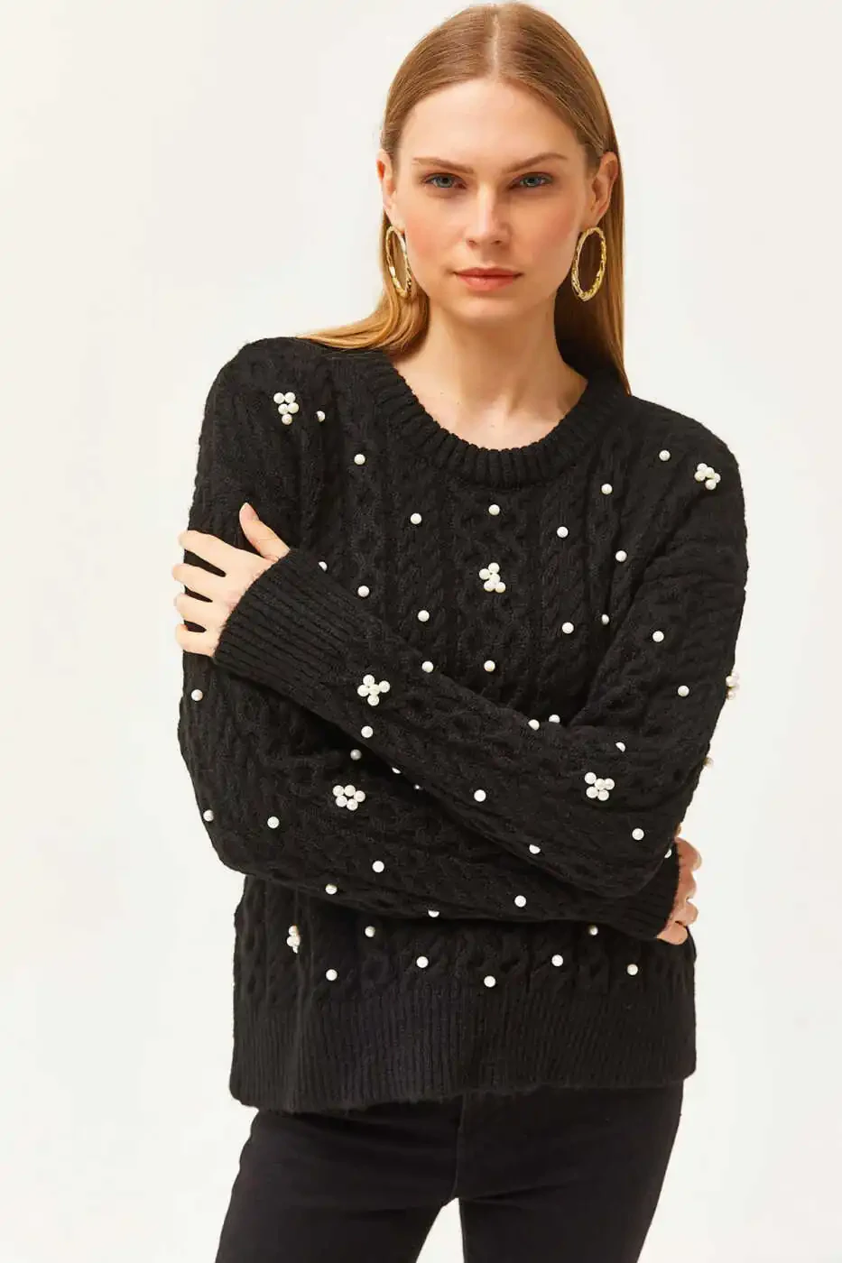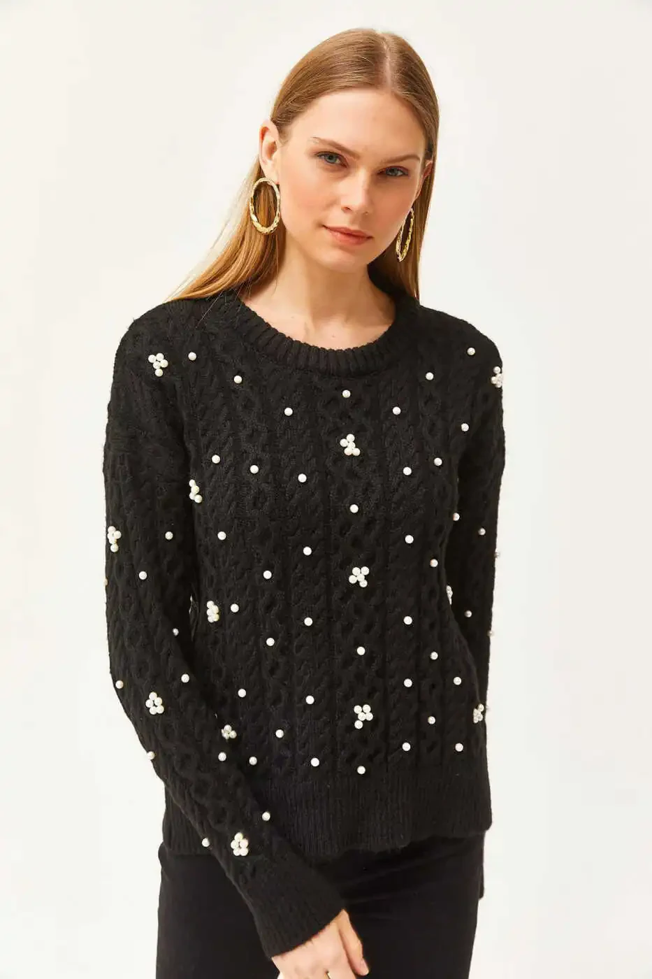 Women's Black Sweater, Braided Sweater, Pearl Detail Sweater, Soft Knitted Sweater