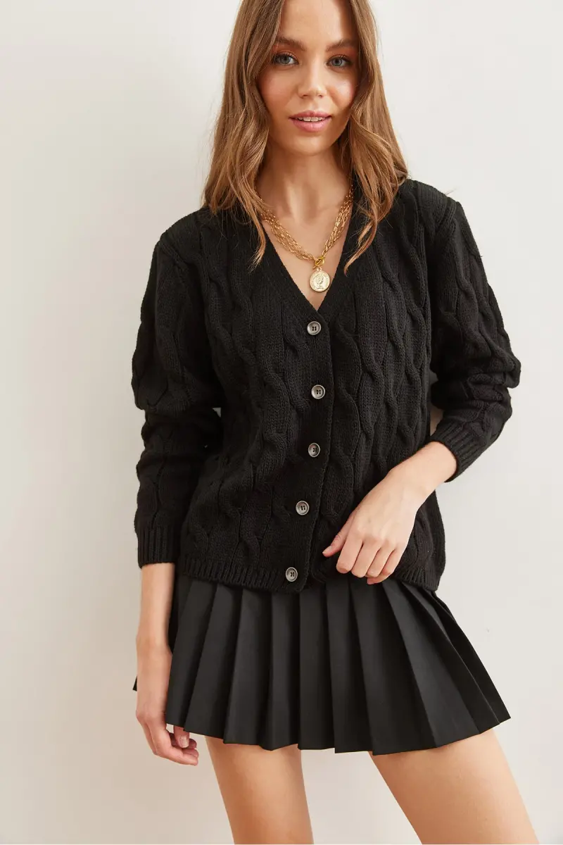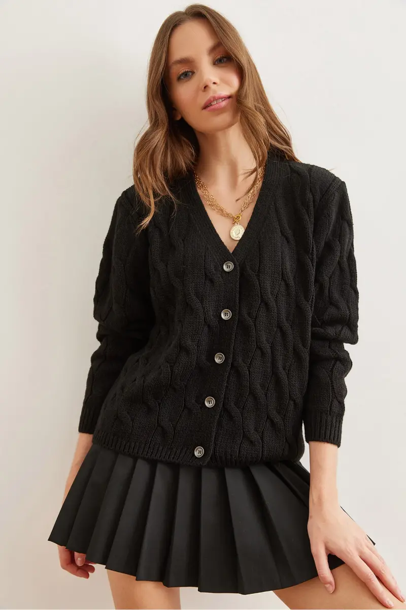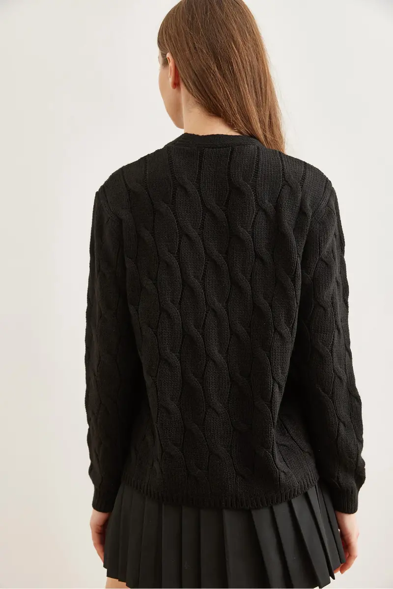 Kadın Siyah Saç Örgülü Triko Hırka HRK-19000298-Siyah