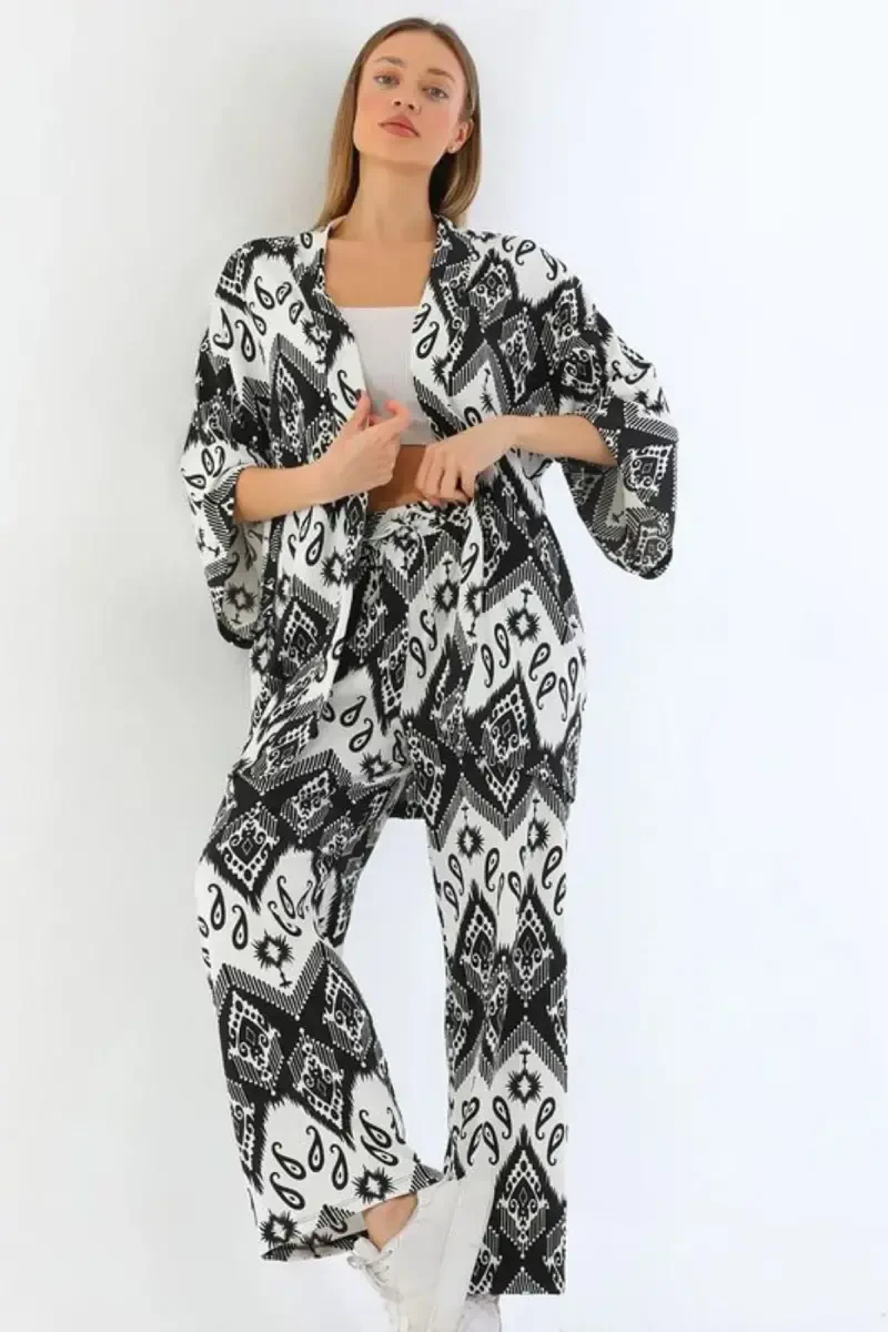 Şal Desenli Bol Paça Palazzo Takım | Kimono & Pantolon