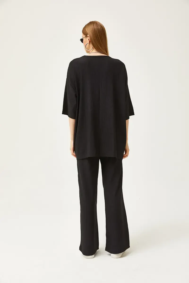 Women's Black Top Kimono Bottom Pants Set TKM-1900 is a special combination that stands out with its modern and elegant design and offers elegance and comfort together. This set is a versatile option that every woman should have in her wardrobe. This set, which you can choose for daily use or a special occasion, helps you reflect your style in the best way. The kimono top offers freedom of movement with its comfortable and wide cut, while giving a stylish and elegant look. The kimono design, combined with the nobility of black, offers a classic elegance that can adapt to any environment. Its high-quality fabric provides a comfortable wearing experience throughout the day. The pants attract attention with their modern cut and body-hugging structure. The classic and timeless stance of black adds a sophisticated air to the pants. These pants, which are both stylish and comfortable, allow you to move comfortably throughout the day. This set is not only stylish but also practical. It can be easily combined and complemented with different accessories. Whether you attend a stylish invitation with high heels or create a daily combination with sneakers, this set will always accompany you. Women's Black Top Kimono Bottom Pants Set TKM-1900 offers long-lasting use with its high-quality fabric, careful workmanship and stylish design. This set, which will be an indispensable part of your wardrobe, will always make you feel stylish and confident. Choose this set to reflect your style and attract attention and make a difference. Let your elegance speak with the magic of black. This set is not just a piece of clothing, but also a style statement. To feel special and reflect your style in the best way, be sure to try the Women's Black Top Kimono Bottom Pants Set TKM-1900. Discover the perfect harmony of elegance and comfort.