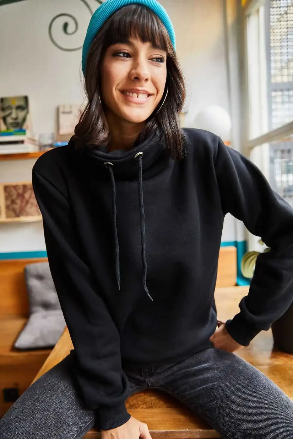 **Women's Black Long Neck Soft Textured Thick Sweatshirt SWT-19000189**Delivered to you with Trendyol's guarantee, this stylish sweatshirt will keep you warm on cold days. Offering a soft touch with its 100% cotton structure, the sweatshirt also protects your neck with its long neck design.**Features:*** 100% cotton structure* Length/Chest Measurements: 59/53 cm* Model Measurements: Height: 1.75, Chest: 89, Waist: 64, Hips: 92* Size on Model: S/36/1* Up to 10 orders can be placed* Free return within 15 daysColors may vary in studio shots due to lighting differences.**Reflect Your Style with Black Sweatshirt**This black sweatshirt combines comfort and elegance. It adapts to every environment from your daily combinations to stylish invitations. While its long neck design protects you from the cold, its soft texture makes you feel comfortable all day long.Let us bring your order to your door with Trendyol's reliable delivery service. We offer a 100% satisfaction guarantee with a 15-day free return option.Order now, complete your style with a black sweatshirt!